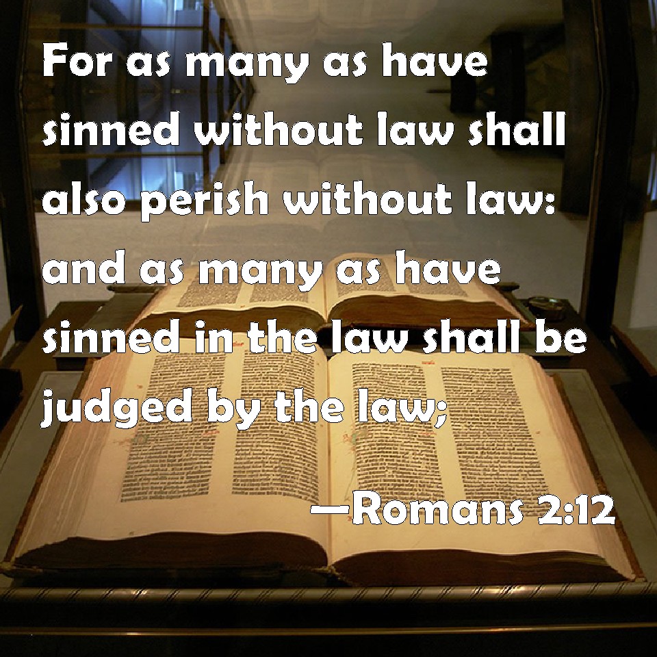 Choose a Background Romans 2:12 For as many as have sinned without law shall also perish without law: and as many as have sinned in the law shall be judged by the law; KJV: For as many as have sinned without law shall also perish without law: and as many as have sinned in the law shall be judged by the law; DRB: For whosoever have sinned without the law, shall perish without the law; and whosoever have sinned in the law, shall be judged by the law. DBT: For as many as have sinned without law shall perish also without law; and as many as have sinned under law shall be judged by law, ERV: For as many as have sinned without law shall also perish without law: and as many as have sinned under law shall be judged by law; WBT: For as many as have sinned without law, shall also perish without law: and as many as have sinned in the law, shall be judged by the law, WEB: For as many as have sinned without law will also perish without the law. As many as have sinned under the law will be judged by the law. YLT: for as many as without law did sin, without law also shall perish, and as many as did sin in law, through law shall be judged,Links Romans 2:12 NIV • Romans 2:12 NLT • Romans 2:12 ESV • Romans 2:12 NASB • Romans 2:12 KJV • Romans 2:12 Interlinear • Romans 2:12 Commentaries • Romans 2:12 Parallel Texts • Romans 2:12 Bible Apps • Romans 2:12 Parallel • Bible Hub |