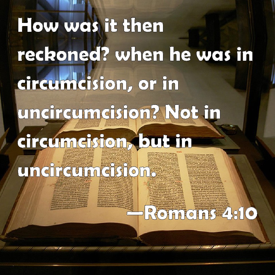 Choose a Background Romans 4:10 How was it then reckoned? when he was in circumcision, or in uncircumcision? Not in circumcision, but in uncircumcision. KJV: How was it then reckoned? when he was in circumcision, or in uncircumcision? Not in circumcision, but in uncircumcision. DRB: How then was it reputed? When he was in circumcision, or in uncircumcision? Not in circumcision, but in uncircumcision. DBT: How then has it been reckoned? when he was in circumcision, or in uncircumcision? Not in circumcision, but in uncircumcision. ERV: How then was it reckoned? when he was in circumcision, or in uncircumcision? Not in circumcision, but in uncircumcision: WBT: How then was it reckoned? when he was in circumcision, or in uncircumcision? Not in circumcision, but in uncircumcision. WEB: How then was it counted? When he was in circumcision, or in uncircumcision? Not in circumcision, but in uncircumcision. YLT: how then was it reckoned? he being in circumcision, or in uncircumcision? not in circumcision, but in uncircumcision;Links Romans 4:10 NIV • Romans 4:10 NLT • Romans 4:10 ESV • Romans 4:10 NASB • Romans 4:10 KJV • Romans 4:10 Interlinear • Romans 4:10 Commentaries • Romans 4:10 Parallel Texts • Romans 4:10 Bible Apps • Romans 4:10 Parallel • Bible Hub |