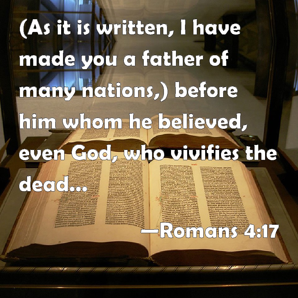 Choose a Background Romans 4:17 (As it is written, I have made you a father of many nations,) before him whom he believed, even God, who vivifies the dead, and calls those things which be not as though they were. KJV: (As it is written, I have made thee a father of many nations,) before him whom he believed, even God, who quickeneth the dead, and calleth those things which be not as though they were. DRB: (As it is written: I have made thee a father of many nations,) before God, whom he believed, who quickeneth the dead; and calleth those things that are not, as those that are. DBT: (according as it is written, I have made thee father of many nations,) before the God whom he believed, who quickens the dead, and calls the things which be not as being; ERV: (as it is written, A father of many nations have I made thee) before him whom he believed, even God, who quickeneth the dead, and calleth the things that are not, as though they were. WBT: (As it is written, I have made thee a father of many nations) before him whom he believed, even God, who reviveth the dead, and calleth those things which are not, as though they were. WEB: As it is written, "I have made you a father of many nations." This is in the presence of him whom he believed: God, who gives life to the dead, and calls the things that are not, as though they were. YLT: who is father of us all (according as it hath been written — 'A father of many nations I have set thee,') before Him whom he did believe — God, who is quickening the dead, and is calling the things that be not as being.Links Romans 4:17 NIV • Romans 4:17 NLT • Romans 4:17 ESV • Romans 4:17 NASB • Romans 4:17 KJV • Romans 4:17 Interlinear • Romans 4:17 Commentaries • Romans 4:17 Parallel Texts • Romans 4:17 Bible Apps • Romans 4:17 Parallel • Bible Hub |