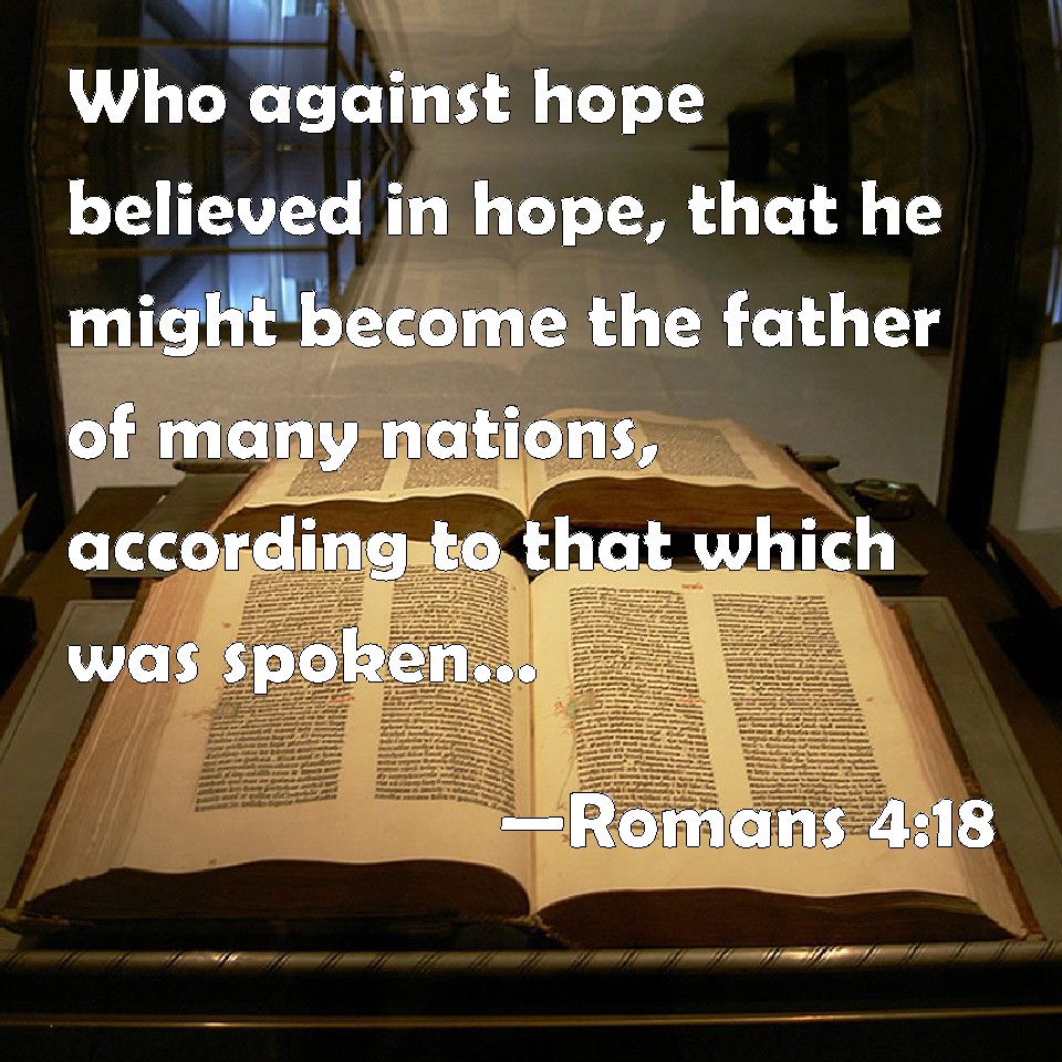 Choose a Background Romans 4:18 Who against hope believed in hope, that he might become the father of many nations, according to that which was spoken, So shall your seed be. KJV: Who against hope believed in hope, that he might become the father of many nations; according to that which was spoken, So shall thy seed be. DRB: Who against hope believed in hope; that he might be made the father of many nations, according to that which was said to him: So shall thy seed be. DBT: who against hope believed in hope to his becoming father of many nations, according to that which was spoken, So shall thy seed be: ERV: Who in hope believed against hope, to the end that he might become a father of many nations, according to that which had been spoken, So shall thy seed be. WBT: Who against hope believed with hope, that he should become the father of many nations; according to that which was spoken, So shall thy seed be. WEB: Who in hope believed against hope, to the end that he might become a father of many nations, according to that which had been spoken, "So will your seed be." YLT: Who, against hope in hope did believe, for his becoming father of many nations according to that spoken: 'So shall thy seed be;'Links Romans 4:18 NIV • Romans 4:18 NLT • Romans 4:18 ESV • Romans 4:18 NASB • Romans 4:18 KJV • Romans 4:18 Interlinear • Romans 4:18 Commentaries • Romans 4:18 Parallel Texts • Romans 4:18 Bible Apps • Romans 4:18 Parallel • Bible Hub |