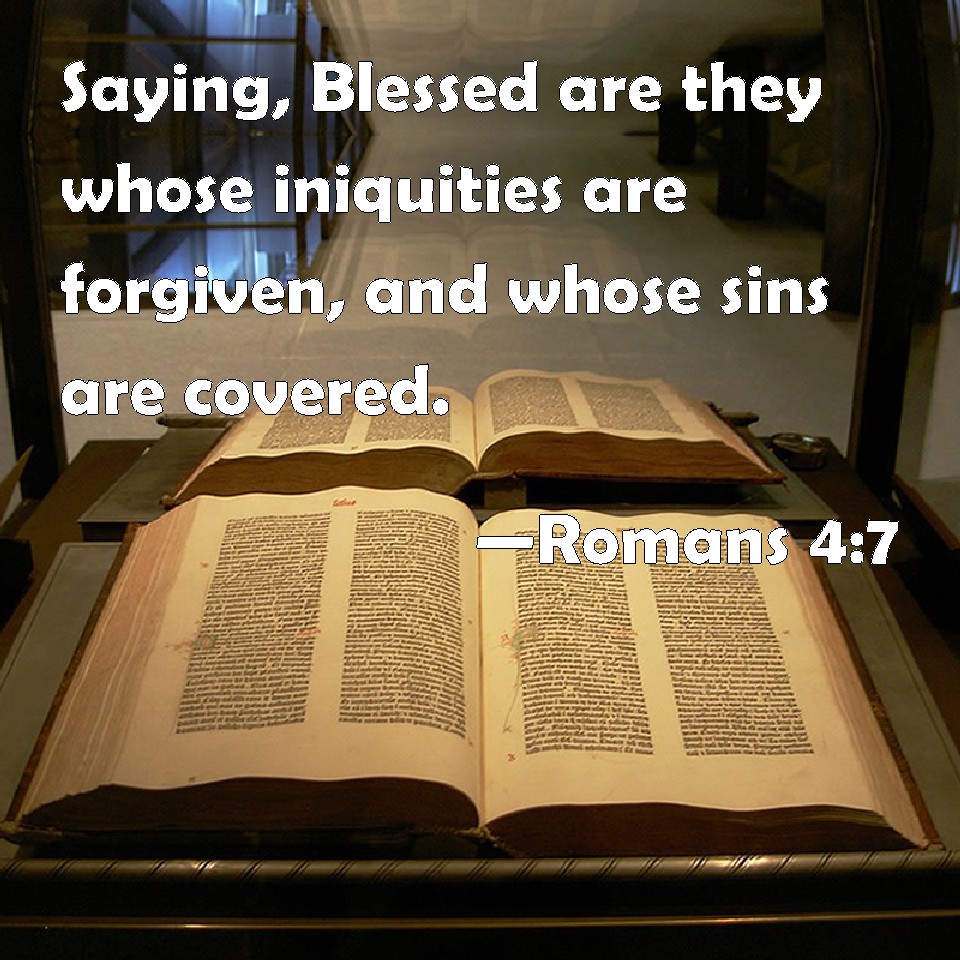 Choose a Background Romans 4:7 Saying, Blessed are they whose iniquities are forgiven, and whose sins are covered. KJV: Saying, Blessed are they whose iniquities are forgiven, and whose sins are covered. DRB: Blessed are they whose iniquities are forgiven, and whose sins are covered. DBT: Blessed they whose lawlessnesses have been forgiven, and whose sins have been covered: ERV: saying, Blessed are they whose iniquities are forgiven, And whose sins are covered. WBT: Saying, Blessed are they whose iniquities are forgiven, and whose sins are covered. WEB: "Blessed are they whose iniquities are forgiven, whose sins are covered. YLT: 'Happy they whose lawless acts were forgiven, and whose sins were covered;Links Romans 4:7 NIV • Romans 4:7 NLT • Romans 4:7 ESV • Romans 4:7 NASB • Romans 4:7 KJV • Romans 4:7 Interlinear • Romans 4:7 Commentaries • Romans 4:7 Parallel Texts • Romans 4:7 Bible Apps • Romans 4:7 Parallel • Bible Hub |