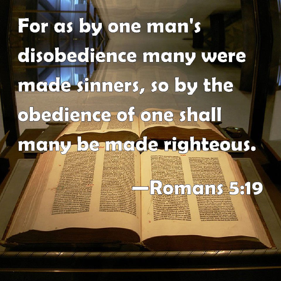 Choose a Background Romans 5:19 For as by one man's disobedience many were made sinners, so by the obedience of one shall many be made righteous. KJV: For as by one man's disobedience many were made sinners, so by the obedience of one shall many be made righteous. DRB: For as by the disobedience of one man, many were made sinners; so also by the obedience of one, many shall be made just. DBT: For as indeed by the disobedience of the one man the many have been constituted sinners, so also by the obedience of the one the many will be constituted righteous. ERV: For as through the one man's disobedience the many were made sinners, even so through the obedience of the one shall the many be made righteous. WBT: For as by one man's disobedience many were made sinners, so by the obedience of one shall many be made righteous. WEB: For as through the one man's disobedience many were made sinners, even so through the obedience of the one, many will be made righteous. YLT: for as through the disobedience of the one man, the many were constituted sinners: so also through the obedience of the one, shall the many be constituted righteous.Links Romans 5:19 NIV • Romans 5:19 NLT • Romans 5:19 ESV • Romans 5:19 NASB • Romans 5:19 KJV • Romans 5:19 Interlinear • Romans 5:19 Commentaries • Romans 5:19 Parallel Texts • Romans 5:19 Bible Apps • Romans 5:19 Parallel • Bible Hub |