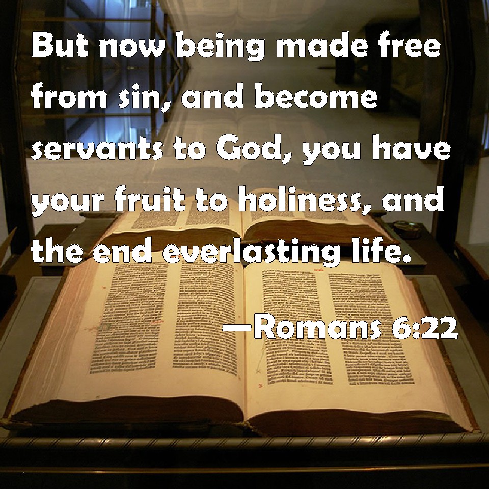 Choose a Background Romans 6:22 But now being made free from sin, and become servants to God, you have your fruit to holiness, and the end everlasting life. KJV: But now being made free from sin, and become servants to God, ye have your fruit unto holiness, and the end everlasting life. DRB: But now being made free from sin, and become servants to God, you have your fruit unto sanctification, and the end life everlasting. DBT: But now, having got your freedom from sin, and having become bondmen to God, ye have your fruit unto holiness, and the end eternal life. ERV: But now being made free from sin, and become servants to God, ye have your fruit unto sanctification, and the end eternal life. WBT: But now being made free from sin, and having become servants to God, ye have your fruit to holiness, and the end everlasting life. WEB: But now, being made free from sin, and having become servants of God, you have your fruit of sanctification, and the result of eternal life. YLT: And now, having been freed from the sin, and having become servants to God, ye have your fruit — to sanctification, and the end life age-during;Links Romans 6:22 NIV • Romans 6:22 NLT • Romans 6:22 ESV • Romans 6:22 NASB • Romans 6:22 KJV • Romans 6:22 Interlinear • Romans 6:22 Commentaries • Romans 6:22 Parallel Texts • Romans 6:22 Bible Apps • Romans 6:22 Parallel • Bible Hub |