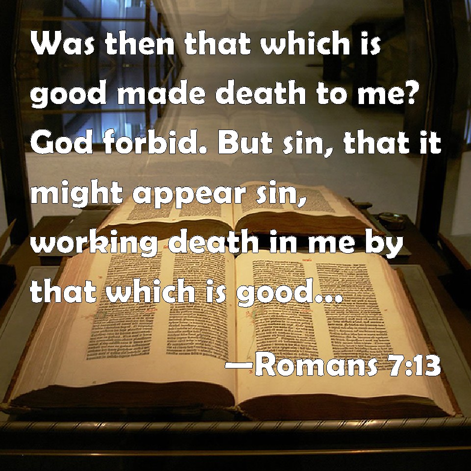 Choose a Background Romans 7:13 Was then that which is good made death to me? God forbid. But sin, that it might appear sin, working death in me by that which is good; that sin by the commandment might become exceeding sinful. KJV: Was then that which is good made death unto me? God forbid. But sin, that it might appear sin, working death in me by that which is good; that sin by the commandment might become exceeding sinful. DRB: Was that then which is good, made death unto me? God forbid. But sin, that it may appear sin, by that which is good, wrought death in me; that sin, by the commandment, might become sinful above measure. DBT: Did then that which is good become death to me? Far be the thought. But sin, that it might appear sin, working death to me by that which is good; in order that sin by the commandment might become exceeding sinful. ERV: Did then that which is good become death unto me? God forbid. But sin, that it might be shewn to be sin, by working death to me through that which is good;—that through the commandment sin might become exceeding sinful. WBT: Was then that which is good made death to me? By no means. But sin, that it might appear sin, working death in me by that which is good; that sin by the commandment might become exceeding sinful. WEB: Did then that which is good become death to me? May it never be! But sin, that it might be shown to be sin, by working death to me through that which is good; that through the commandment sin might become exceeding sinful. YLT: That which is good then, to me hath it become death? let it not be! but the sin, that it might appear sin, through the good, working death to me, that the sin might become exceeding sinful through the command,Links Romans 7:13 NIV • Romans 7:13 NLT • Romans 7:13 ESV • Romans 7:13 NASB • Romans 7:13 KJV • Romans 7:13 Interlinear • Romans 7:13 Commentaries • Romans 7:13 Parallel Texts • Romans 7:13 Bible Apps • Romans 7:13 Parallel • Bible Hub |