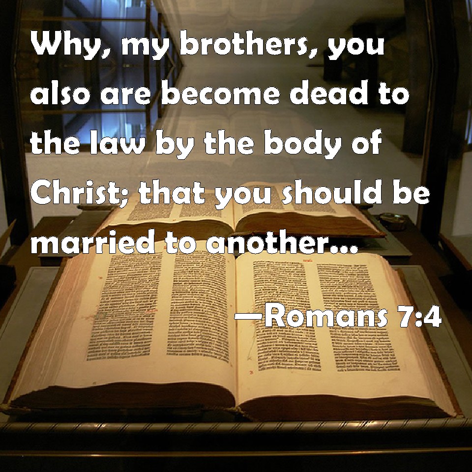 Choose a Background Romans 7:4 Why, my brothers, you also are become dead to the law by the body of Christ; that you should be married to another, even to him who is raised from the dead, that we should bring forth fruit to God. KJV: Wherefore, my brethren, ye also are become dead to the law by the body of Christ; that ye should be married to another, even to him who is raised from the dead, that we should bring forth fruit unto God. DRB: Therefore, my brethren, you also are become dead to the law, by the body of Christ; that you may belong to another, who is risen again from the dead, that we may bring forth fruit to God. DBT: So that, my brethren, ye also have been made dead to the law by the body of the Christ, to be to another, who has been raised up from among the dead, in order that we might bear fruit to God. ERV: Wherefore, my brethren, ye also were made dead to the law through the body of Christ; that ye should be joined to another, even to him who was raised from the dead, that we might bring forth fruit unto God. WBT: Wherefore, my brethren, ye also are become dead to the law by the body of Christ; that ye should be married to another, even to him who is raised from the dead, that we should bring forth fruit to God. WEB: Therefore, my brothers, you also were made dead to the law through the body of Christ, that you would be joined to another, to him who was raised from the dead, that we might bring forth fruit to God. YLT: So that, my brethren, ye also were made dead to the law through the body of the Christ, for your becoming another's, who out of the dead was raised up, that we might bear fruit to God;Links Romans 7:4 NIV • Romans 7:4 NLT • Romans 7:4 ESV • Romans 7:4 NASB • Romans 7:4 KJV • Romans 7:4 Interlinear • Romans 7:4 Commentaries • Romans 7:4 Parallel Texts • Romans 7:4 Bible Apps • Romans 7:4 Parallel • Bible Hub |
