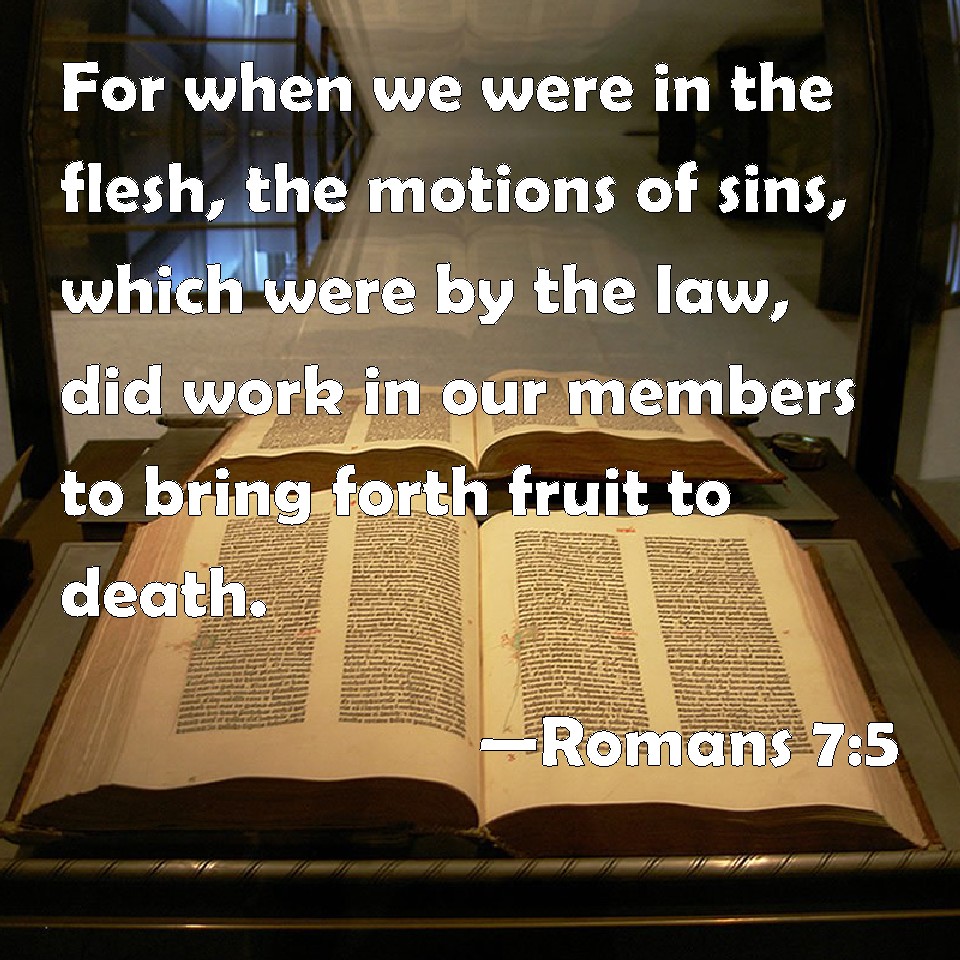 Choose a Background Romans 7:5 For when we were in the flesh, the motions of sins, which were by the law, did work in our members to bring forth fruit to death. KJV: For when we were in the flesh, the motions of sins, which were by the law, did work in our members to bring forth fruit unto death. DRB: For when we were in the flesh, the passions of sins, which were by the law, did work in our members, to bring forth fruit unto death. DBT: For when we were in the flesh the passions of sins, which were by the law, wrought in our members to bring forth fruit to death; ERV: For when we were in the flesh, the sinful passions, which were through the law, wrought in our members to bring forth fruit unto death. WBT: For when we were in the flesh, the motions of sins, which were by the law, did work in our members to bring forth fruit to death: WEB: For when we were in the flesh, the sinful passions which were through the law, worked in our members to bring forth fruit to death. YLT: for when we were in the flesh, the passions of the sins, that are through the law, were working in our members, to bear fruit to the death;Links Romans 7:5 NIV • Romans 7:5 NLT • Romans 7:5 ESV • Romans 7:5 NASB • Romans 7:5 KJV • Romans 7:5 Interlinear • Romans 7:5 Commentaries • Romans 7:5 Parallel Texts • Romans 7:5 Bible Apps • Romans 7:5 Parallel • Bible Hub |
