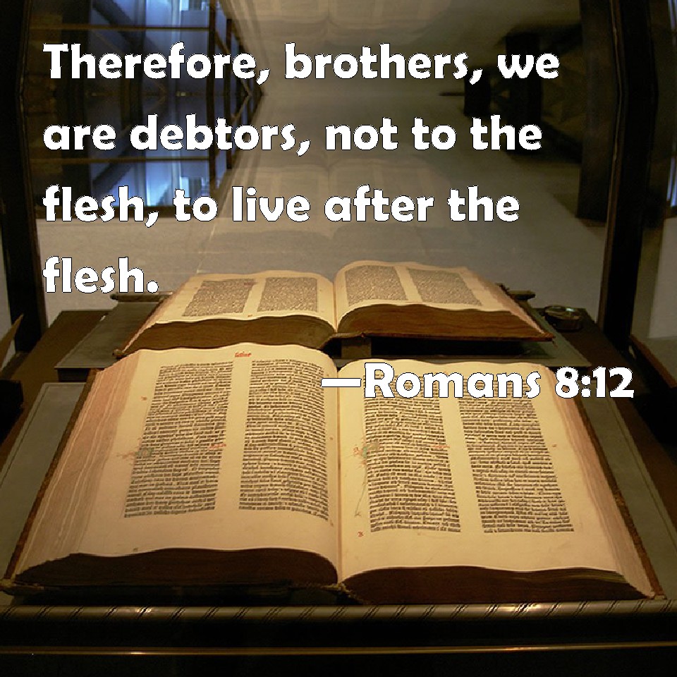 Choose a Background Romans 8:12 Therefore, brothers, we are debtors, not to the flesh, to live after the flesh. KJV: Therefore, brethren, we are debtors, not to the flesh, to live after the flesh. DRB: Therefore, brethren, we are debtors, not to the flesh, to live according to the flesh. DBT: So then, brethren, we are debtors, not to the flesh, to live according to flesh; ERV: So then, brethren, we are debtors, not to the flesh, to live after the flesh: WBT: Therefore, brethren, we are debtors, not to the flesh, to live according to the flesh. WEB: So then, brothers, we are debtors, not to the flesh, to live after the flesh. YLT: So, then, brethren, we are debtors, not to the flesh, to live according to the flesh;Links Romans 8:12 NIV • Romans 8:12 NLT • Romans 8:12 ESV • Romans 8:12 NASB • Romans 8:12 KJV • Romans 8:12 Interlinear • Romans 8:12 Commentaries • Romans 8:12 Parallel Texts • Romans 8:12 Bible Apps • Romans 8:12 Parallel • Bible Hub |