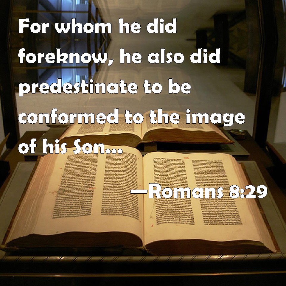 Choose a Background Romans 8:29 For whom he did foreknow, he also did predestinate to be conformed to the image of his Son, that he might be the firstborn among many brothers. KJV: For whom he did foreknow, he also did predestinate to be conformed to the image of his Son, that he might be the firstborn among many brethren. DRB: For whom he foreknew, he also predestinated to be made conformable to the image of his Son; that he might be the firstborn amongst many brethren. DBT: Because whom he has foreknown, he has also predestinated to be conformed to the image of his Son, so that he should be the firstborn among many brethren. ERV: For whom he foreknew, he also foreordained to be conformed to the image of his Son, that he might be the firstborn among many brethren: WBT: For whom he did foreknow, he also did predestinate to be conformed to the image of his Son, that he might be the first-born among many brethren. WEB: For whom he foreknew, he also predestined to be conformed to the image of his Son, that he might be the firstborn among many brothers. YLT: because whom He did foreknow, He also did fore-appoint, conformed to the image of His Son, that he might be first-born among many brethren;Links Romans 8:29 NIV • Romans 8:29 NLT • Romans 8:29 ESV • Romans 8:29 NASB • Romans 8:29 KJV • Romans 8:29 Interlinear • Romans 8:29 Commentaries • Romans 8:29 Parallel Texts • Romans 8:29 Bible Apps • Romans 8:29 Parallel • Bible Hub |