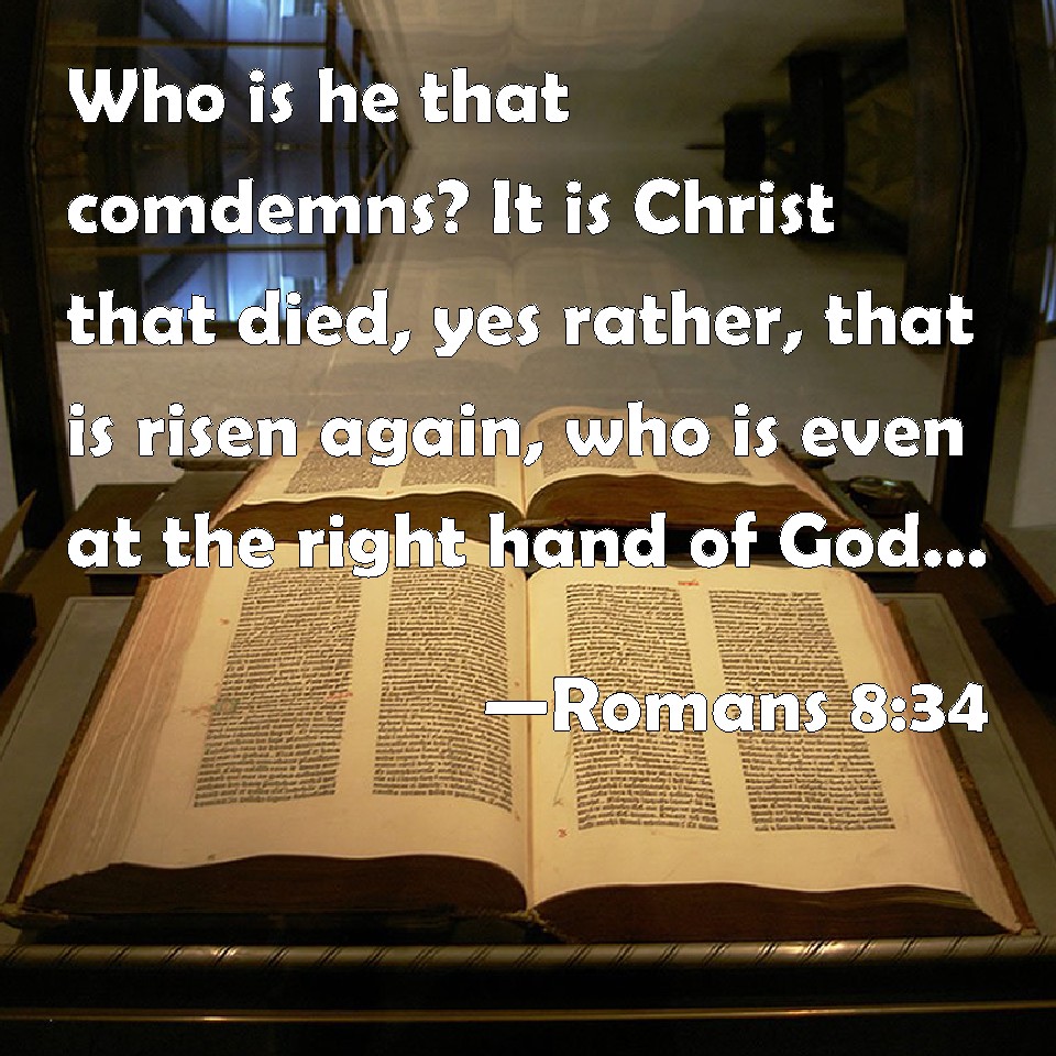 Choose a Background Romans 8:34 Who is he that comdemns? It is Christ that died, yes rather, that is risen again, who is even at the right hand of God, who also makes intercession for us. KJV: Who is he that condemneth? It is Christ that died, yea rather, that is risen again, who is even at the right hand of God, who also maketh intercession for us. DRB: Who is he that shall condemn? Christ Jesus that died, yea that is risen also again; who is at the right hand of God, who also maketh intercession for us. DBT: who is he that condemns? It is Christ who has died, but rather has been also raised up; who is also at the right hand of God; who also intercedes for us. ERV: who is he that shall condemn? It is Christ Jesus that died, yea rather, that was raised from the dead, who is at the right hand of God, who also maketh intercession for us. WBT: Who is he that condemneth? It is Christ that died, or rather that is risen again, who is even at the right hand of God, who also maketh intercession for us. WEB: Who is he who condemns? It is Christ who died, yes rather, who was raised from the dead, who is at the right hand of God, who also makes intercession for us. YLT: who is he that is condemning? Christ is He that died, yea, rather also, was raised up; who is also on the right hand of God — who also doth intercede for us.Links Romans 8:34 NIV • Romans 8:34 NLT • Romans 8:34 ESV • Romans 8:34 NASB • Romans 8:34 KJV • Romans 8:34 Interlinear • Romans 8:34 Commentaries • Romans 8:34 Parallel Texts • Romans 8:34 Bible Apps • Romans 8:34 Parallel • Bible Hub |