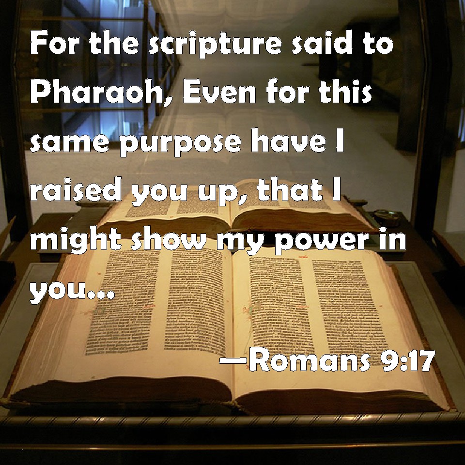 Choose a Background Romans 9:17 For the scripture said to Pharaoh, Even for this same purpose have I raised you up, that I might show my power in you, and that my name might be declared throughout all the earth. KJV: For the scripture saith unto Pharaoh, Even for this same purpose have I raised thee up, that I might shew my power in thee, and that my name might be declared throughout all the earth. DRB: For the scripture saith to Pharao: To this purpose have I raised thee, that I may shew my power in thee, and that my name may be declared throughout all the earth. DBT: For the scripture says to Pharaoh, For this very thing I have raised thee up from amongst men, that I might thus shew in thee my power, and so that my name should be declared in all the earth. ERV: For the scripture saith unto Pharaoh, For this very purpose did I raise thee up, that I might shew in thee my power, and that my name might be published abroad in all the earth. WBT: For the scripture saith to Pharaoh, Even for this same purpose have I raised thee up, that I might show my power in thee, and that my name might be declared throughout all the earth. WEB: For the Scripture says to Pharaoh, "For this very purpose I caused you to be raised up, that I might show in you my power, and that my name might be proclaimed in all the earth." YLT: for the Writing saith to Pharaoh — 'For this very thing I did raise thee up, that I might shew in thee My power, and that My name might be declared in all the land;'Links Romans 9:17 NIV • Romans 9:17 NLT • Romans 9:17 ESV • Romans 9:17 NASB • Romans 9:17 KJV • Romans 9:17 Interlinear • Romans 9:17 Commentaries • Romans 9:17 Parallel Texts • Romans 9:17 Bible Apps • Romans 9:17 Parallel • Bible Hub |