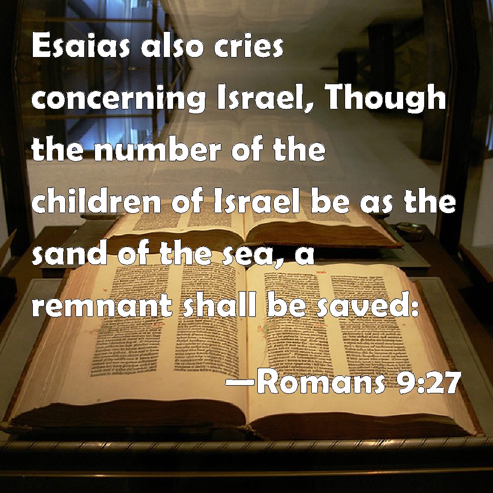 Choose a Background Romans 9:27 Esaias also cries concerning Israel, Though the number of the children of Israel be as the sand of the sea, a remnant shall be saved: KJV: Esaias also crieth concerning Israel, Though the number of the children of Israel be as the sand of the sea, a remnant shall be saved: DRB: And Isaias crieth out concerning Israel: If the number of the children of Israel be as the sand of the sea, a remnant shall be saved. DBT: But Esaias cries concerning Israel, Should the number of the children of Israel be as the sand of the sea, the remnant shall be saved: ERV: And Isaiah crieth concerning Israel, If the number of the children of Israel be as the sand of the sea, it is the remnant that shall be saved: WBT: Isaiah also crieth concerning Israel, Though the number of the children of Israel be as the sand of the sea, a remnant shall be saved: WEB: Isaiah cries concerning Israel, "If the number of the children of Israel are as the sand of the sea, it is the remnant who will be saved; YLT: And Isaiah doth cry concerning Israel, 'If the number of the sons of Israel may be as the sand of the sea, the remnant shall be saved;Links Romans 9:27 NIV • Romans 9:27 NLT • Romans 9:27 ESV • Romans 9:27 NASB • Romans 9:27 KJV • Romans 9:27 Interlinear • Romans 9:27 Commentaries • Romans 9:27 Parallel Texts • Romans 9:27 Bible Apps • Romans 9:27 Parallel • Bible Hub |