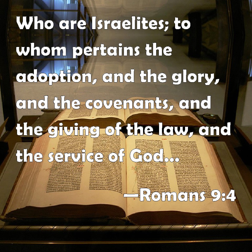 Choose a Background Romans 9:4 Who are Israelites; to whom pertains the adoption, and the glory, and the covenants, and the giving of the law, and the service of God, and the promises; KJV: Who are Israelites; to whom pertaineth the adoption, and the glory, and the covenants, and the giving of the law, and the service of God, and the promises; DRB: Who are Israelites, to whom belongeth the adoption as of children, and the glory, and the testament, and the giving of the law, and the service of God, and the promises: DBT: who are Israelites; whose is the adoption, and the glory, and the covenants, and the law-giving, and the service, and the promises; ERV: who are Israelites; whose is the adoption, and the glory, and the covenants, and the giving of the law, and the service of God, and the promises; WBT: Who are Israelites; to whom pertain the adoption, and the glory, and the covenants, and the giving of the law, and the service of God, and the promises; WEB: who are Israelites; whose is the adoption, the glory, the covenants, the giving of the law, the service, and the promises; YLT: who are Israelites, whose is the adoption, and the glory, and the covenants, and the lawgiving, and the service, and the promises,Links Romans 9:4 NIV • Romans 9:4 NLT • Romans 9:4 ESV • Romans 9:4 NASB • Romans 9:4 KJV • Romans 9:4 Interlinear • Romans 9:4 Commentaries • Romans 9:4 Parallel Texts • Romans 9:4 Bible Apps • Romans 9:4 Parallel • Bible Hub |