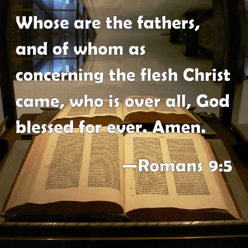 Choose a Background Romans 9:5 Whose are the fathers, and of whom as concerning the flesh Christ came, who is over all, God blessed for ever. Amen. KJV: Whose are the fathers, and of whom as concerning the flesh Christ came, who is over all, God blessed for ever. Amen. DRB: Whose are the fathers, and of whom is Christ, according to the flesh, who is over all things, God blessed for ever. Amen. DBT: whose are the fathers; and of whom, as according to flesh, is the Christ, who is over all, God blessed for ever. Amen. ERV: whose are the fathers, and of whom is Christ as concerning the flesh, who is over all, God blessed for ever. Amen. WBT: Whose are the fathers, and from whom according to the flesh, Christ came, who is over all, God blessed for ever. Amen. WEB: of whom are the fathers, and from whom is Christ as concerning the flesh, who is over all, God, blessed forever. Amen. YLT: whose are the fathers, and of whom is the Christ, according to the flesh, who is over all, God blessed to the ages. Amen.Links Romans 9:5 NIV • Romans 9:5 NLT • Romans 9:5 ESV • Romans 9:5 NASB • Romans 9:5 KJV • Romans 9:5 Interlinear • Romans 9:5 Commentaries • Romans 9:5 Parallel Texts • Romans 9:5 Bible Apps • Romans 9:5 Parallel • Bible Hub |