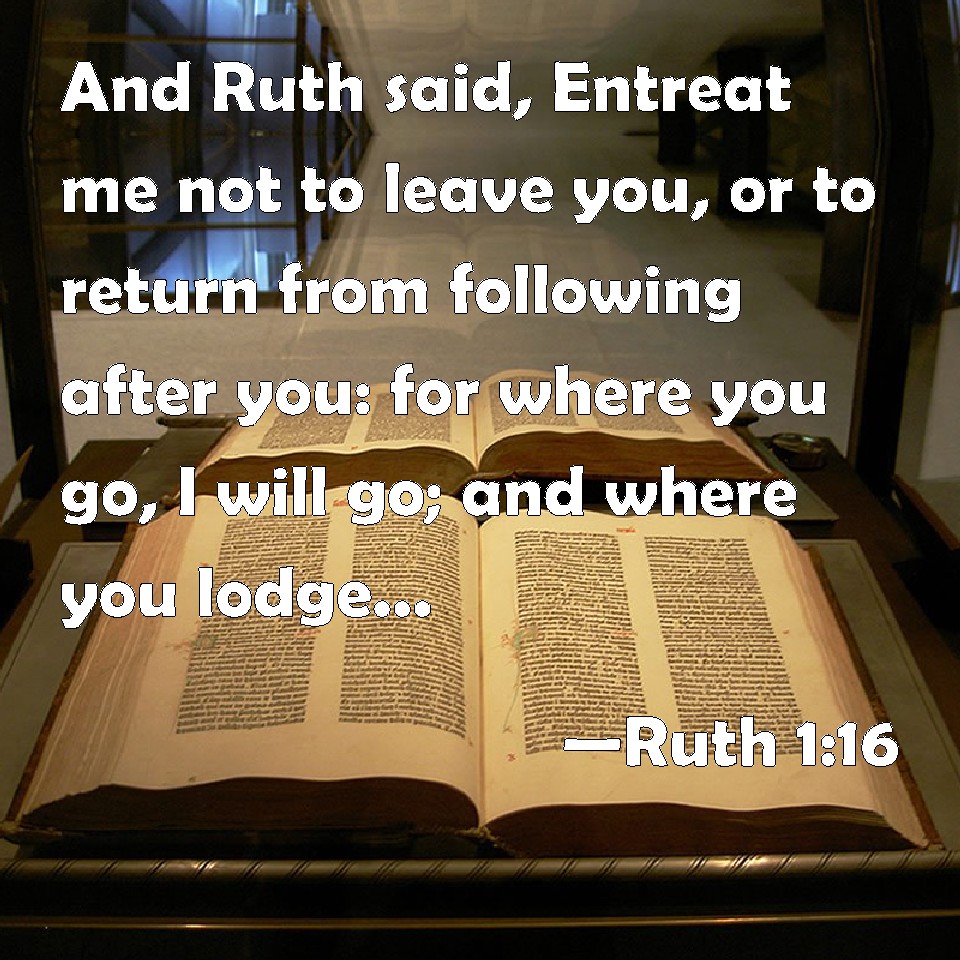 Choose a Background Ruth 1:16 And Ruth said, Entreat me not to leave you, or to return from following after you: for where you go, I will go; and where you lodge, I will lodge: your people shall be my people, and your God my God: KJV: And Ruth said, Intreat me not to leave thee, or to return from following after thee: for whither thou goest, I will go; and where thou lodgest, I will lodge: thy people shall be my people, and thy God my God: DRB: She answered: Be not against me, to desire that I should leave thee and depart: for whithersoever thou shalt go, I will go: and where thou shalt dwell, I also will dwell. Thy people shall be my people, and thy God my God. DBT: And Ruth said, Do not intreat me to leave thee, to return from following after thee; for whither thou goest I will go, and where thou lodgest I will lodge: thy people shall be my people, and thy God my God; ERV: And Ruth said, Entreat me not to leave thee, and to return from following after thee: for whither thou goest, I will go; and where thou lodgest, I will lodge: thy people shall be my people, and thy God my God: WBT: And Ruth said, Entreat me not to leave thee, or to return from following thee: for whither thou goest, I will go; and where thou lodgest, I will lodge: thy people shall be my people, and thy God my God: WEB: Ruth said, "Don't entreat me to leave you, and to return from following after you, for where you go, I will go; and where you lodge, I will lodge; your people shall be my people, and your God my God; YLT: And Ruth saith, 'Urge me not to leave thee — to turn back from after thee; for whither thou goest I go, and where thou lodgest I lodge; thy people is my people, and thy God my God.Links Ruth 1:16 NIV • Ruth 1:16 NLT • Ruth 1:16 ESV • Ruth 1:16 NASB • Ruth 1:16 KJV • Ruth 1:16 Interlinear • Ruth 1:16 Commentaries • Ruth 1:16 Parallel Texts • Ruth 1:16 Bible Apps • Ruth 1:16 Parallel • Bible Hub |