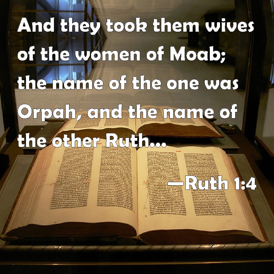 Choose a Background Ruth 1:4 And they took them wives of the women of Moab; the name of the one was Orpah, and the name of the other Ruth: and they dwelled there about ten years. KJV: And they took them wives of the women of Moab; the name of the one was Orpah, and the name of the other Ruth: and they dwelled there about ten years. DRB: And they took wives of the women of Moab, of which one was called Orpha, and the other Ruth. And they dwelt there ten years. DBT: And they took them Moabitish wives; the name of the one was Orpah, and the name of the second Ruth: and they abode there about ten years. ERV: And they took them wives of the women of Moab; the name of the one was Orpah, and the name of the other Ruth: and they dwelled there about ten years. WBT: And they took to themselves wives of the women of Moab; the name of the one was Orpah, and the name of the other Ruth: and they dwelt there about ten years. WEB: They took them wives of the women of Moab; the name of the one was Orpah, and the name of the other Ruth: and they lived there about ten years. YLT: and they take to them wives, Moabitesses: the name of the one is Orpah, and the name of the second Ruth; and they dwell there about ten years.Links Ruth 1:4 NIV • Ruth 1:4 NLT • Ruth 1:4 ESV • Ruth 1:4 NASB • Ruth 1:4 KJV • Ruth 1:4 Interlinear • Ruth 1:4 Commentaries • Ruth 1:4 Parallel Texts • Ruth 1:4 Bible Apps • Ruth 1:4 Parallel • Bible Hub |