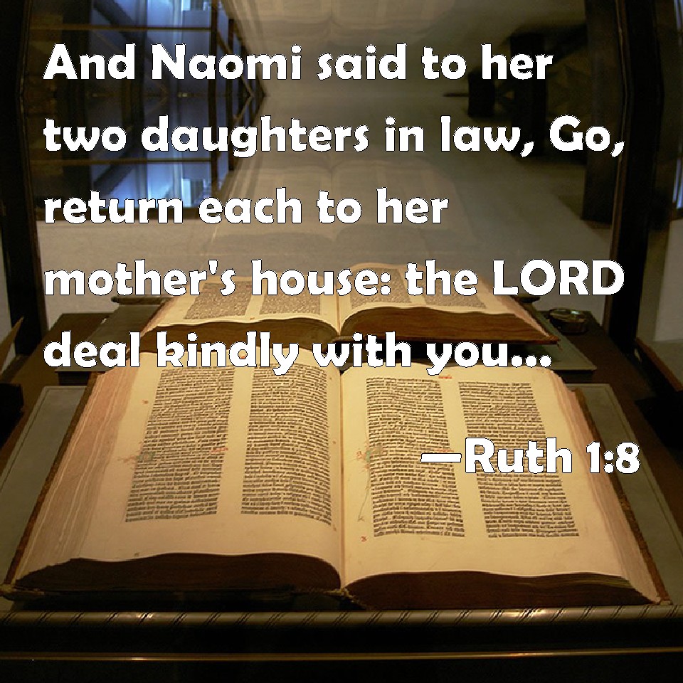Choose a Background Ruth 1:8 And Naomi said to her two daughters in law, Go, return each to her mother's house: the LORD deal kindly with you, as you have dealt with the dead, and with me. KJV: And Naomi said unto her two daughters in law, Go, return each to her mother's house: the LORD deal kindly with you, as ye have dealt with the dead, and with me. DRB: She said to them: Go ye home to your mothers: the Lord deal mercifully with you, as you have dealt with the dead and with me. DBT: And Naomi said to her two daughters-in-law, Go, return each to her mother's house. Jehovah deal kindly with you, as ye have dealt with the dead and with me. ERV: And Naomi said unto her two daughters in law, Go, return each of you to her mother's house: the LORD deal kindly with you as ye have dealt with the dead, and with me. WBT: And Naomi said to her two daughters-in-law, Go, return each to her mother's house: the LORD deal kindly with you, as ye have dealt with the dead, and with me. WEB: Naomi said to her two daughters-in-law, "Go, return each of you to her mother's house: Yahweh deal kindly with you, as you have dealt with the dead, and with me. YLT: And Naomi saith to her two daughters-in-law, 'Go, turn back, each to the house of her mother; Jehovah doth with you kindness as ye have done with the dead, and with me;Links Ruth 1:8 NIV • Ruth 1:8 NLT • Ruth 1:8 ESV • Ruth 1:8 NASB • Ruth 1:8 KJV • Ruth 1:8 Interlinear • Ruth 1:8 Commentaries • Ruth 1:8 Parallel Texts • Ruth 1:8 Bible Apps • Ruth 1:8 Parallel • Bible Hub |