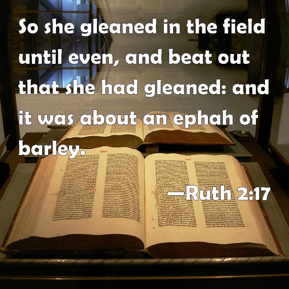 Choose a Background Ruth 2:17 So she gleaned in the field until even, and beat out that she had gleaned: and it was about an ephah of barley. KJV: So she gleaned in the field until even, and beat out that she had gleaned: and it was about an ephah of barley. DRB: She gleaned therefore in the field till evening: and beating out with a rod and threshing what she had gleaned, she found about the measure of an ephi of barley, that is, three bushels: DBT: And she gleaned in the field until even, and beat out what she had gleaned; and it was about an ephah of barley. ERV: So she gleaned in the field until even; and she beat out that she had gleaned, and it was about an ephah of barley. WBT: So she gleaned in the field until evening, and beat out that which she had gleaned: and it was about an ephah of barley. WEB: So she gleaned in the field until evening; and she beat out that which she had gleaned, and it was about an ephah of barley. YLT: And she gleaneth in the field till the evening, and beateth out that which she hath gleaned, and it is about an ephah of barley;Links Ruth 2:17 NIV • Ruth 2:17 NLT • Ruth 2:17 ESV • Ruth 2:17 NASB • Ruth 2:17 KJV • Ruth 2:17 Interlinear • Ruth 2:17 Commentaries • Ruth 2:17 Parallel Texts • Ruth 2:17 Bible Apps • Ruth 2:17 Parallel • Bible Hub |