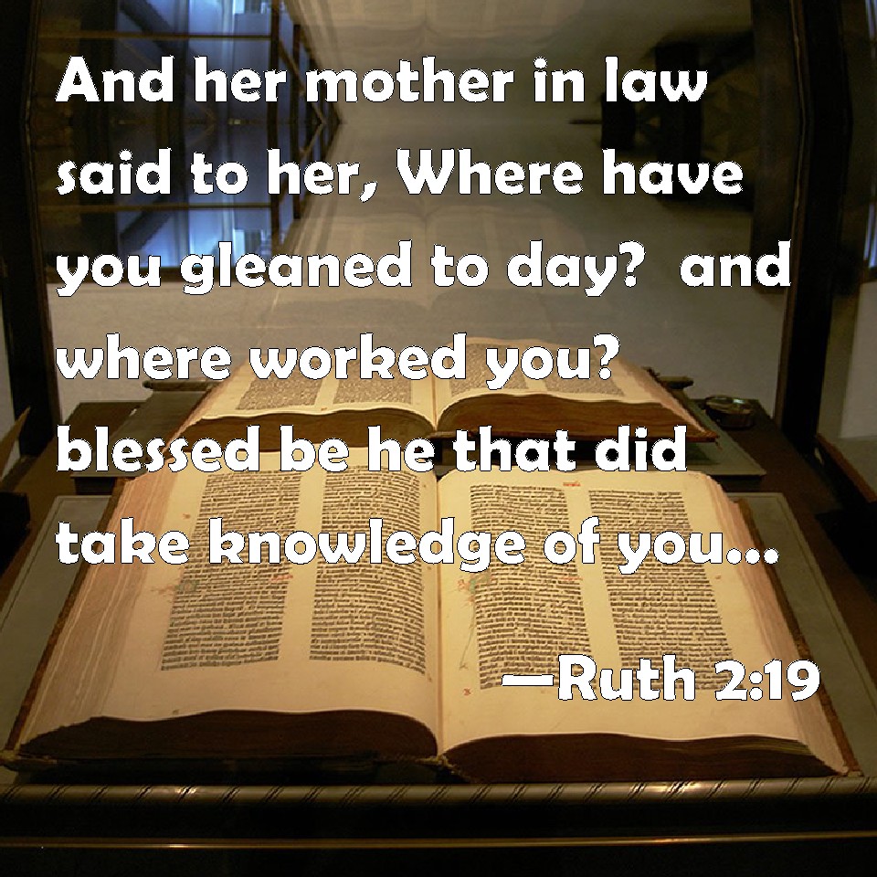 Choose a Background Ruth 2:19 And her mother in law said to her, Where have you gleaned to day? and where worked you? blessed be he that did take knowledge of you. And she showed her mother in law with whom she had worked, and said, The man's name with whom I worked to day is Boaz. KJV: And her mother in law said unto her, Where hast thou gleaned to day? and where wroughtest thou? blessed be he that did take knowledge of thee. And she shewed her mother in law with whom she had wrought, and said, The man's name with whom I wrought to day is Boaz. DRB: And her mother in law said to her: Where hast thou gleaned to day, and where hast thou wrought? blessed be he that hath had pity on thee. And she told her with whom she had wrought: and she told the man's name, that he was called Booz. DBT: And her mother-in-law said to her, Where hast thou gleaned to-day? and where hast thou wrought? Blessed be he that did regard thee! And she told her mother-in-law with whom she had wrought, and said, The man's name with whom I wrought to-day is Boaz. ERV: And her mother in law said unto her, Where hast thou gleaned today? and where wroughtest thou? blessed be he that did take knowledge of thee. And she shewed her mother in law with whom she had wrought, and said, The man's name with whom I wrought today is Boaz. WBT: And her mother-in-law said to her, Where hast thou gleaned to-day? and where hast thou labored? blessed be he that took knowledge of thee. And she showed her mother-in-law with whom she had wrought, and said, The man's name with whom I wrought to-day is Boaz. WEB: Her mother-in-law said to her, "Where have you gleaned today? Where have you worked? Blessed be he who noticed you." She showed her mother-in-law with whom she had worked, and said, "The man's name with whom I worked today is Boaz." YLT: And her mother-in-law saith to her, 'Where hast thou gleaned to-day? and where hast thou wrought? may he who is discerning thee be blessed.' And she declareth to her mother-in-law with whom she hath wrought, and saith, 'The name of the man with whom I have wrought to-day is Boaz.'Links Ruth 2:19 NIV • Ruth 2:19 NLT • Ruth 2:19 ESV • Ruth 2:19 NASB • Ruth 2:19 KJV • Ruth 2:19 Interlinear • Ruth 2:19 Commentaries • Ruth 2:19 Parallel Texts • Ruth 2:19 Bible Apps • Ruth 2:19 Parallel • Bible Hub |