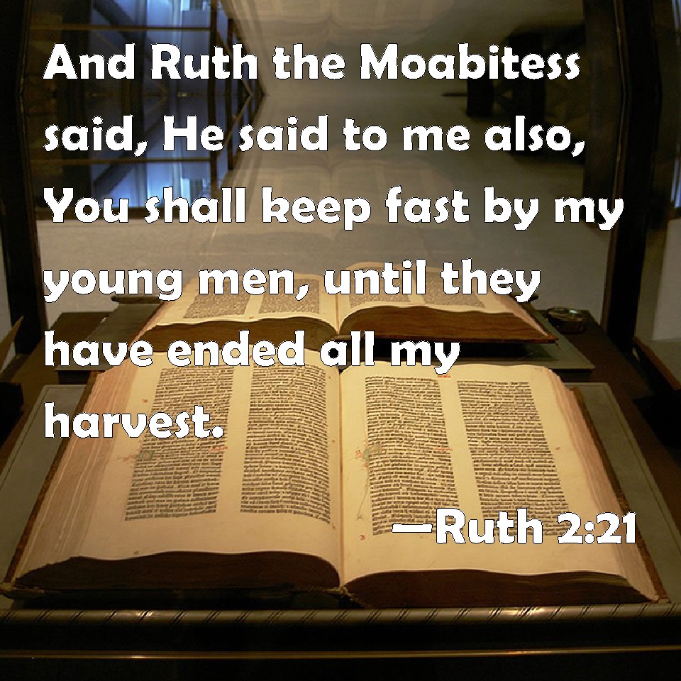 Choose a Background Ruth 2:21 And Ruth the Moabitess said, He said to me also, You shall keep fast by my young men, until they have ended all my harvest. KJV: And Ruth the Moabitess said, He said unto me also, Thou shalt keep fast by my young men, until they have ended all my harvest. DRB: And Ruth said, He also charged me, that I should keep close to his reapers, till all the corn should be reaped. DBT: And Ruth the Moabitess said, He said to me also, Thou shalt keep with my young men until they have ended all my harvest. ERV: And Ruth the Moabitess said, Yea, he said unto me, Thou shalt keep fast by my young men, until they have ended all my harvest. WBT: And Ruth the Moabitess said, He said to me also, Thou shalt keep fast by my young men, until they have ended all my harvest. WEB: Ruth the Moabitess said, "Yes, he said to me, 'You shall stay close to my young men, until they have ended all my harvest.'" YLT: And Ruth the Moabitess saith, 'Also he surely said unto me, Near the young people whom I have thou dost cleave till they have completed the whole of the harvest which I have.'Links Ruth 2:21 NIV • Ruth 2:21 NLT • Ruth 2:21 ESV • Ruth 2:21 NASB • Ruth 2:21 KJV • Ruth 2:21 Interlinear • Ruth 2:21 Commentaries • Ruth 2:21 Parallel Texts • Ruth 2:21 Bible Apps • Ruth 2:21 Parallel • Bible Hub |
