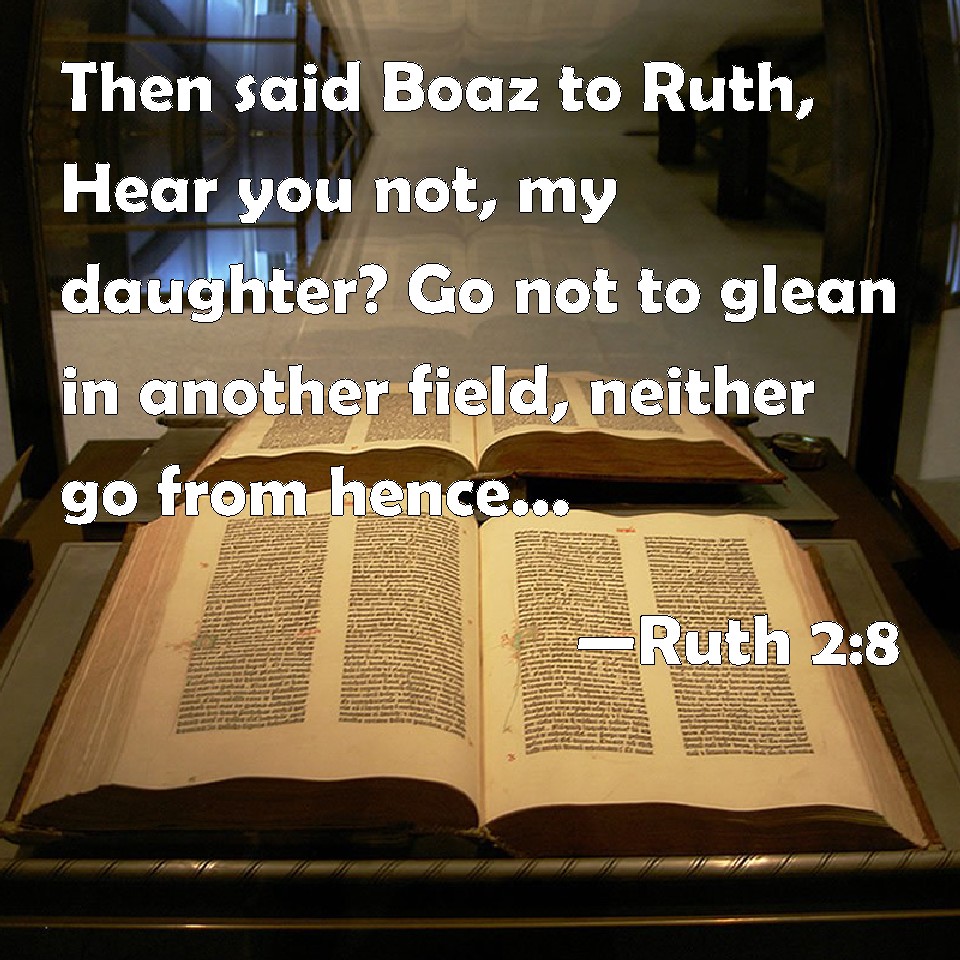 Choose a Background Ruth 2:8 Then said Boaz to Ruth, Hear you not, my daughter? Go not to glean in another field, neither go from hence, but abide here fast by my maidens: KJV: Then said Boaz unto Ruth, Hearest thou not, my daughter? Go not to glean in another field, neither go from hence, but abide here fast by my maidens: DRB: And Booz said to Ruth: Hear me, daughter, do not go to glean in any other field, and do not depart from this place: but keep with my maids, DBT: And Boaz said to Ruth, Hearest thou not, my daughter? Go not to glean in another field, neither go from here, but keep here with my maidens. ERV: Then said Boaz unto Ruth, Hearest thou not, my daughter? Go not to glean in another field, neither pass from hence, but abide here fast by my maidens. WBT: Then said Boaz to Ruth, Hearest thou not, my daughter? Go not to glean in another field, neither go from hence, but abide here fast by my maidens: WEB: Then Boaz said to Ruth, "Listen, my daughter. Don't go to glean in another field, and don't go from here, but stay here close to my maidens. YLT: And Boaz saith unto Ruth, 'Hast thou not heard, my daughter? go not to glean in another field, and also, pass not over from this, and thus thou dost cleave to my young women:Links Ruth 2:8 NIV • Ruth 2:8 NLT • Ruth 2:8 ESV • Ruth 2:8 NASB • Ruth 2:8 KJV • Ruth 2:8 Interlinear • Ruth 2:8 Commentaries • Ruth 2:8 Parallel Texts • Ruth 2:8 Bible Apps • Ruth 2:8 Parallel • Bible Hub |