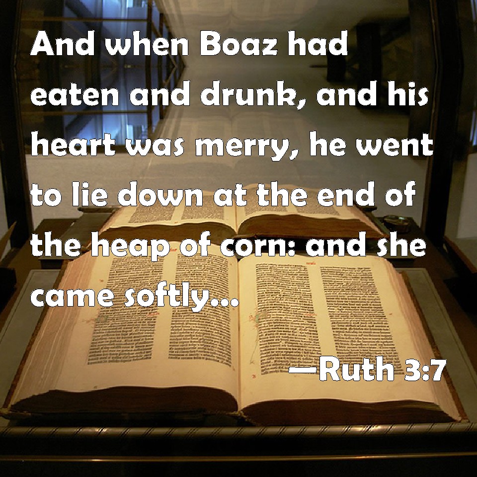 Choose a Background Ruth 3:7 And when Boaz had eaten and drunk, and his heart was merry, he went to lie down at the end of the heap of corn: and she came softly, and uncovered his feet, and laid her down. KJV: And when Boaz had eaten and drunk, and his heart was merry, he went to lie down at the end of the heap of corn: and she came softly, and uncovered his feet, and laid her down. DRB: And when Booz had eaten, and drunk, and was merry, he went to sleep by the heap of sheaves, and she came softly and uncovering his feet, laid herself down. DBT: And Boaz ate and drank, and his heart was merry, and he went to lie down at the end of the heap of corn. Then she went softly, and uncovered his feet, and laid herself down. ERV: And when Boaz had eaten and drunk, and his heart was merry, he went to lie down at the end of the heap of corn: and she came softly, and uncovered his feet, and laid her down. WBT: And when Boaz had eaten and drank, and his heart was merry, he went to lie down at the end of the heap of corn: and she came softly, and uncovered his feet, and laid herself down. WEB: When Boaz had eaten and drunk, and his heart was merry, he went to lie down at the end of the heap of grain. She came softly, uncovered his feet, and laid her down. YLT: And Boaz eateth and drinketh, and his heart is glad; and he goeth in to lie down at the end of the heap; and she cometh in gently, and uncovereth his feet, and lieth down.Links Ruth 3:7 NIV • Ruth 3:7 NLT • Ruth 3:7 ESV • Ruth 3:7 NASB • Ruth 3:7 KJV • Ruth 3:7 Interlinear • Ruth 3:7 Commentaries • Ruth 3:7 Parallel Texts • Ruth 3:7 Bible Apps • Ruth 3:7 Parallel • Bible Hub |