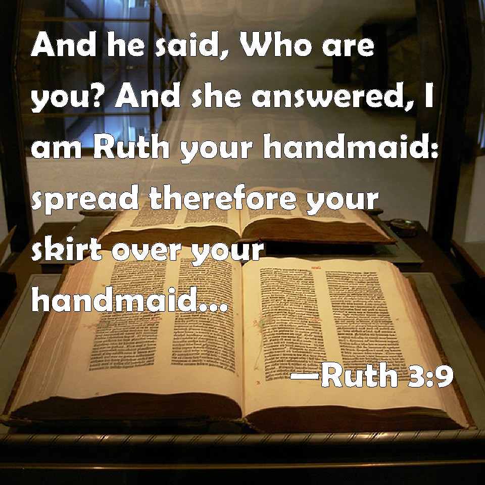 Choose a Background Ruth 3:9 And he said, Who are you? And she answered, I am Ruth your handmaid: spread therefore your skirt over your handmaid; for you are a near kinsman. KJV: And he said, Who art thou? And she answered, I am Ruth thine handmaid: spread therefore thy skirt over thine handmaid; for thou art a near kinsman. DRB: And he said to her: Who art thou? And she answered: I am Ruth thy handmaid: spread thy coverlet over thy servant, for thou art a near kinsman. DBT: And he said, Who art thou? And she answered, I am Ruth, thy handmaid: spread thy skirt over thy handmaid; for thou hast the right of redemption. ERV: And he said, Who art thou? And she answered, I am Ruth thine handmaid: spread therefore thy skirt over thine handmaid; for thou art a near kinsman. WBT: And he said, Who art thou? And she answered, I am Ruth thy handmaid: spread therefore thy skirt over thy handmaid; for thou art a near kinsman. WEB: He said, "Who are you?" She answered, "I am Ruth your handmaid. Therefore spread your skirt over your handmaid; for you are a near kinsman." YLT: And he saith, 'Who art thou?' and she saith, 'I am Ruth thy handmaid, and thou hast spread thy skirt over thy handmaid, for thou art a redeemer.'Links Ruth 3:9 NIV • Ruth 3:9 NLT • Ruth 3:9 ESV • Ruth 3:9 NASB • Ruth 3:9 KJV • Ruth 3:9 Interlinear • Ruth 3:9 Commentaries • Ruth 3:9 Parallel Texts • Ruth 3:9 Bible Apps • Ruth 3:9 Parallel • Bible Hub |