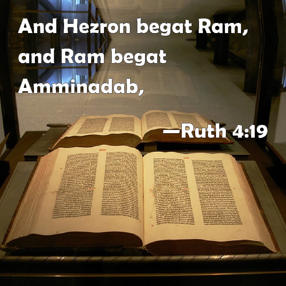 Choose a Background Ruth 4:19 And Hezron begat Ram, and Ram begat Amminadab, KJV: And Hezron begat Ram, and Ram begat Amminadab, DRB: Esron begot Aram, Aram begot Aminadab, DBT: and Hezron begot Ram, and Ram begot Amminadab, ERV: and Hezron begat Ram, and Ram begat Amminadab; WBT: And Hezron begat Ram, and Ram begat Amminadab, WEB: and Hezron became the father of Ram, and Ram became the father of Amminadab, YLT: and Hezron begat Ram, and Ram begat Amminidab,Links Ruth 4:19 NIV • Ruth 4:19 NLT • Ruth 4:19 ESV • Ruth 4:19 NASB • Ruth 4:19 KJV • Ruth 4:19 Interlinear • Ruth 4:19 Commentaries • Ruth 4:19 Parallel Texts • Ruth 4:19 Bible Apps • Ruth 4:19 Parallel • Bible Hub |