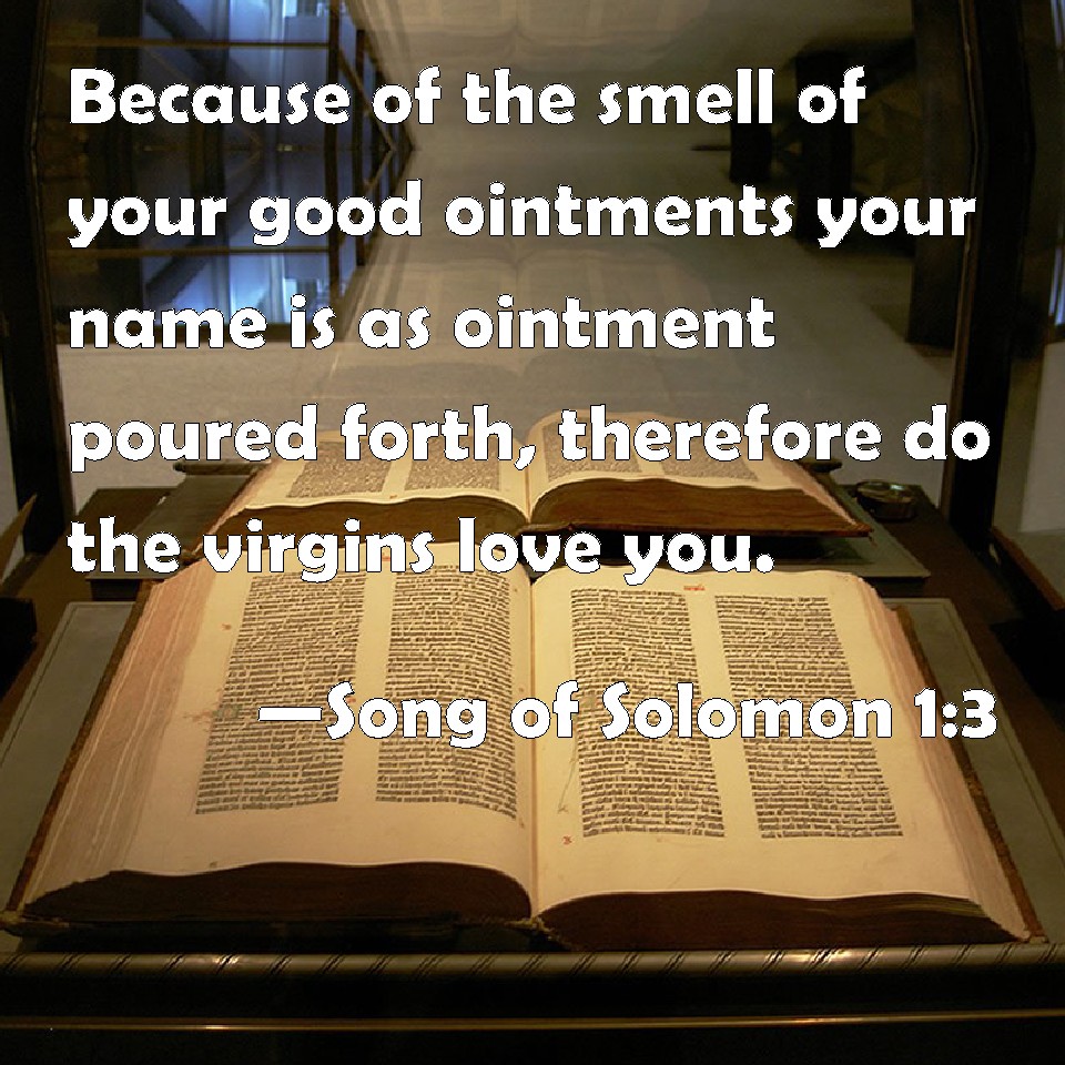 Song of Solomon 1:3 Because of the smell of your good ointments your name is as ointment poured forth, therefore do the virgins love you.