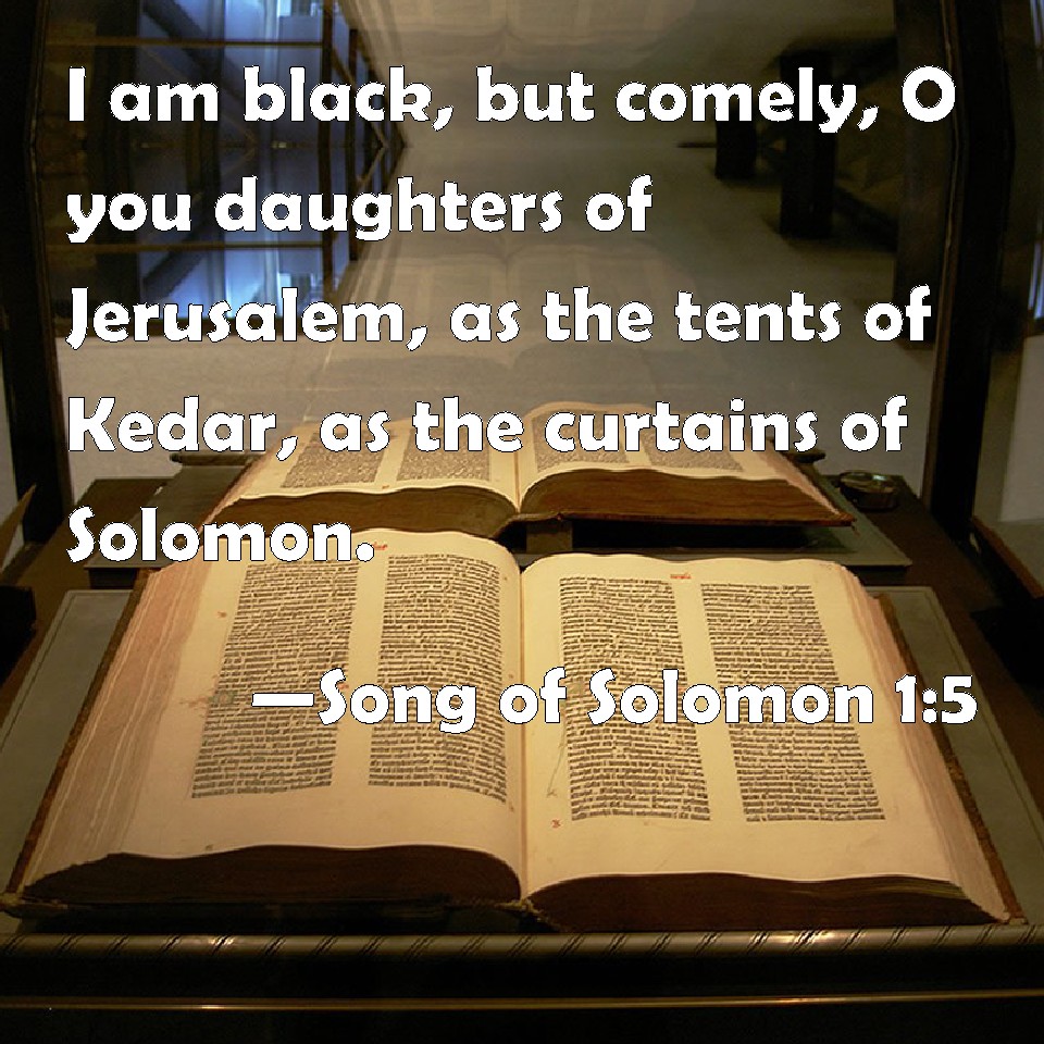 Choose a Background Song of Solomon 1:5 I am black, but comely, O you daughters of Jerusalem, as the tents of Kedar, as the curtains of Solomon. KJV: I am black, but comely, O ye daughters of Jerusalem, as the tents of Kedar, as the curtains of Solomon. DRB: I am black but beautiful, O ye daughters of Jerusalem, as the tents of Cedar, as the curtains of Solomon. DBT: I am black, but comely, daughters of Jerusalem, As the tents of Kedar, As the curtains of Solomon. ERV: I am black, but comely, O ye daughters of Jerusalem, as the tents of Kedar, as the curtains of Solomon. WBT: I am black, but comely, O ye daughters of Jerusalem, as the tents of Kedar, as the curtains of Solomon. WEB: I am dark, but lovely, you daughters of Jerusalem, like Kedar's tents, like Solomon's curtains. YLT: Dark am I, and comely, daughters of Jerusalem, As tents of Kedar, as curtains of Solomon.Links Song of Solomon 1:5 NIV • Song of Solomon 1:5 NLT • Song of Solomon 1:5 ESV • Song of Solomon 1:5 NASB • Song of Solomon 1:5 KJV • Song of Solomon 1:5 Interlinear • Song of Solomon 1:5 Commentaries • Song of Solomon 1:5 Parallel Texts • Song of Solomon 1:5 Bible Apps • Song of Solomon 1:5 Parallel • Bible Hub |