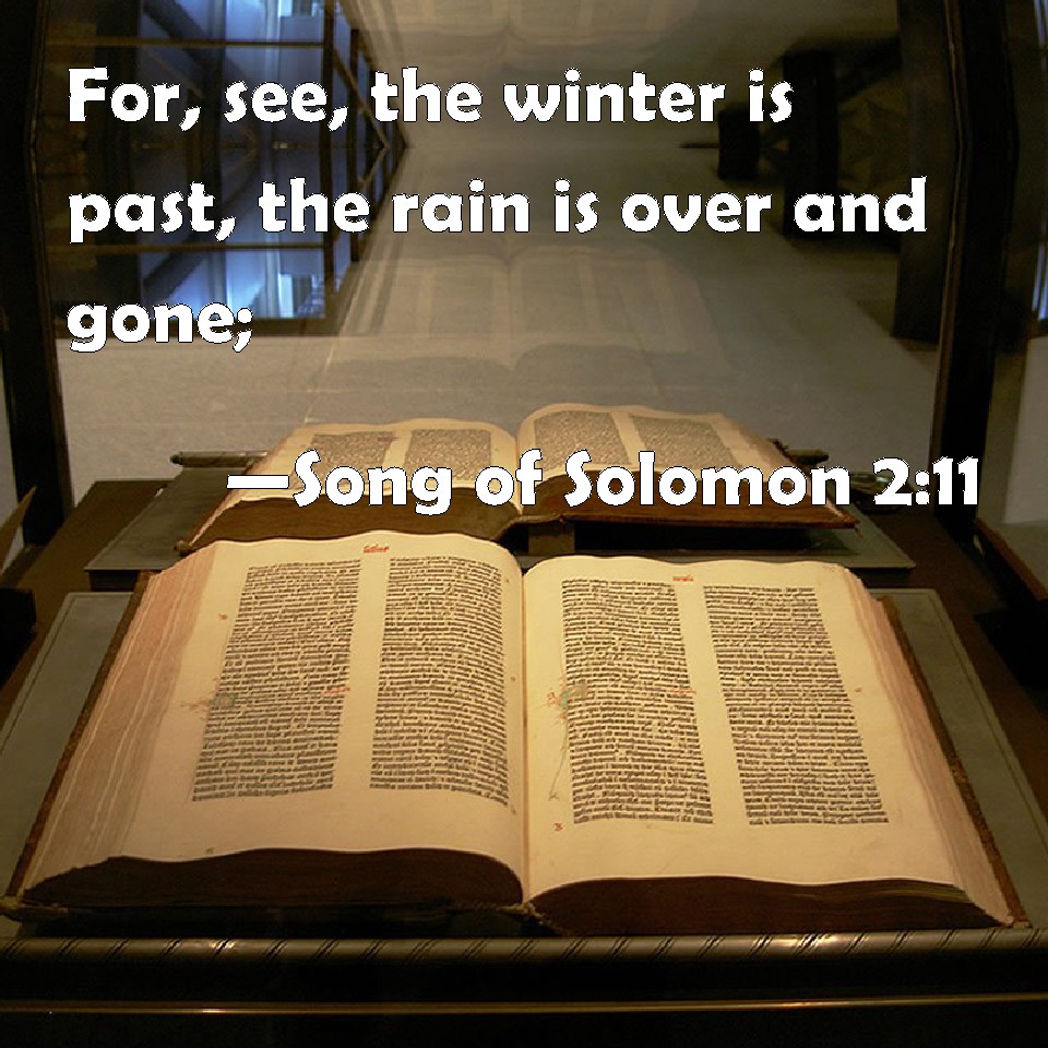 Choose a Background Song of Solomon 2:11 For, see, the winter is past, the rain is over and gone; KJV: For, lo, the winter is past, the rain is over and gone; DRB: For winter is now past, the rain is over and gone. DBT: For behold, the winter is past, The rain is over, it is gone: ERV: For, lo, the winter is past, the rain is over and gone; WBT: For lo, the winter is past, the rain is over and gone. WEB: For, behold, the winter is past. The rain is over and gone. YLT: For lo, the winter hath passed by, The rain hath passed away — it hath gone.Links Song of Solomon 2:11 NIV • Song of Solomon 2:11 NLT • Song of Solomon 2:11 ESV • Song of Solomon 2:11 NASB • Song of Solomon 2:11 KJV • Song of Solomon 2:11 Interlinear • Song of Solomon 2:11 Commentaries • Song of Solomon 2:11 Parallel Texts • Song of Solomon 2:11 Bible Apps • Song of Solomon 2:11 Parallel • Bible Hub |
