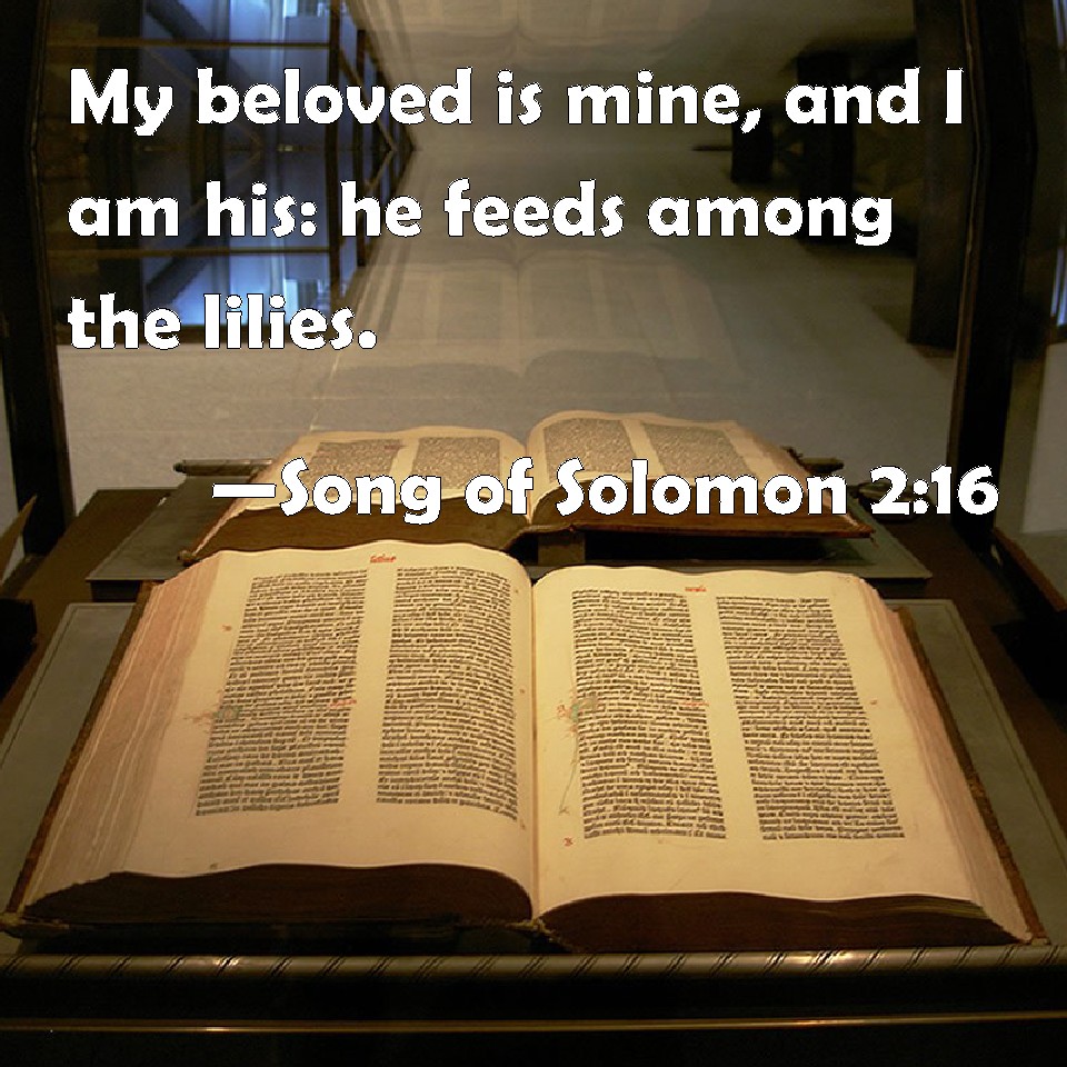 Choose a Background Song of Solomon 2:16 My beloved is mine, and I am his: he feeds among the lilies. KJV: My beloved is mine, and I am his: he feedeth among the lilies. DRB: My beloved to me, and I to him who feedeth among the lilies, DBT: My beloved is mine, and I am his; He feedeth his flock among the lilies, ERV: My beloved is mine, and I am his: he feedeth his flock among the lilies. WBT: My beloved is mine, and I am his: he feedeth among the lilies. WEB: My beloved is mine, and I am his. He browses among the lilies. YLT: My beloved is mine, and I am his, Who is delighting among the lilies,Links Song of Solomon 2:16 NIV • Song of Solomon 2:16 NLT • Song of Solomon 2:16 ESV • Song of Solomon 2:16 NASB • Song of Solomon 2:16 KJV • Song of Solomon 2:16 Interlinear • Song of Solomon 2:16 Commentaries • Song of Solomon 2:16 Parallel Texts • Song of Solomon 2:16 Bible Apps • Song of Solomon 2:16 Parallel • Bible Hub |