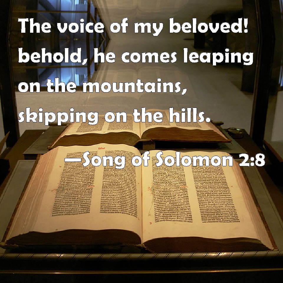 Choose a Background Song of Solomon 2:8 The voice of my beloved! behold, he comes leaping on the mountains, skipping on the hills. KJV: The voice of my beloved! behold, he cometh leaping upon the mountains, skipping upon the hills. DRB: The voice of my beloved, behold he cometh leaping upon the mountains, skipping over the hills. DBT: The voice of my beloved! Behold, he cometh Leaping upon the mountains, Skipping upon the hills. ERV: The voice of my beloved! behold, he cometh, leaping upon the mountains, skipping upon the hills. WBT: The voice of my beloved! behold, he cometh leaping upon the mountains, skipping upon the hills. WEB: The voice of my beloved! Behold, he comes, leaping on the mountains, skipping on the hills. YLT: The voice of my beloved! lo, this — he is coming, Leaping on the mountains, skipping on the hills.Links Song of Solomon 2:8 NIV • Song of Solomon 2:8 NLT • Song of Solomon 2:8 ESV • Song of Solomon 2:8 NASB • Song of Solomon 2:8 KJV • Song of Solomon 2:8 Interlinear • Song of Solomon 2:8 Commentaries • Song of Solomon 2:8 Parallel Texts • Song of Solomon 2:8 Bible Apps • Song of Solomon 2:8 Parallel • Bible Hub |