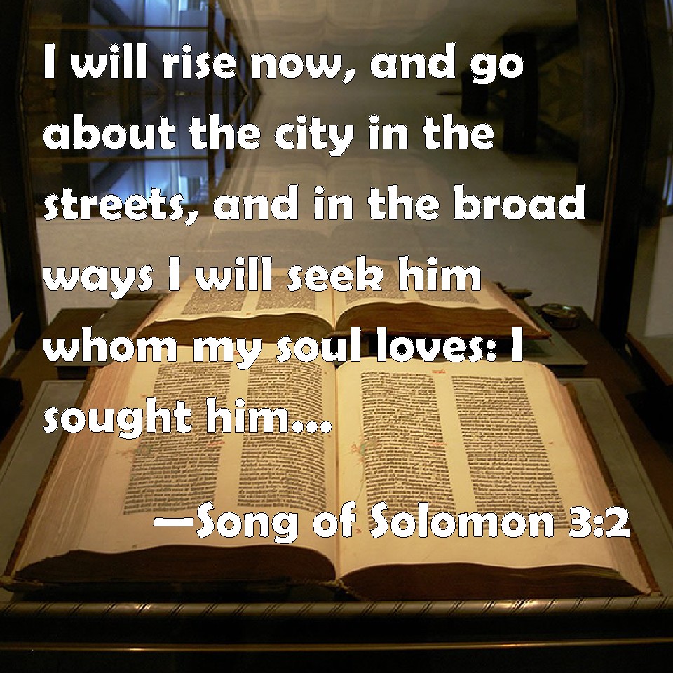 Choose a Background Song of Solomon 3:2 I will rise now, and go about the city in the streets, and in the broad ways I will seek him whom my soul loves: I sought him, but I found him not. KJV: I will rise now, and go about the city in the streets, and in the broad ways I will seek him whom my soul loveth: I sought him, but I found him not. DRB: I will rise, and will go about the city: in the streets and the broad ways I will seek him whom my soul loveth: I sought him, and I found him not. DBT: I will rise now, and go about the city; In the streets and in the broadways Will I seek him whom my soul loveth: I sought him, but I found him not. ERV: I said, I will rise now, and go about the city, in the streets and in the broad ways, I will seek him whom my soul loveth: I sought him, but I found him not. WBT: I will rise now, and go about the city in the streets, and in the broad ways I will seek him whom my soul loveth: I sought him, but I found him not. WEB: I will get up now, and go about the city; in the streets and in the squares I will seek him whom my soul loves. I sought him, but I didn't find him. YLT: — Pray, let me rise, and go round the city, In the streets and in the broad places, I seek him whom my soul hath loved! — I sought him, and I found him not.Links Song of Solomon 3:2 NIV • Song of Solomon 3:2 NLT • Song of Solomon 3:2 ESV • Song of Solomon 3:2 NASB • Song of Solomon 3:2 KJV • Song of Solomon 3:2 Interlinear • Song of Solomon 3:2 Commentaries • Song of Solomon 3:2 Parallel Texts • Song of Solomon 3:2 Bible Apps • Song of Solomon 3:2 Parallel • Bible Hub |