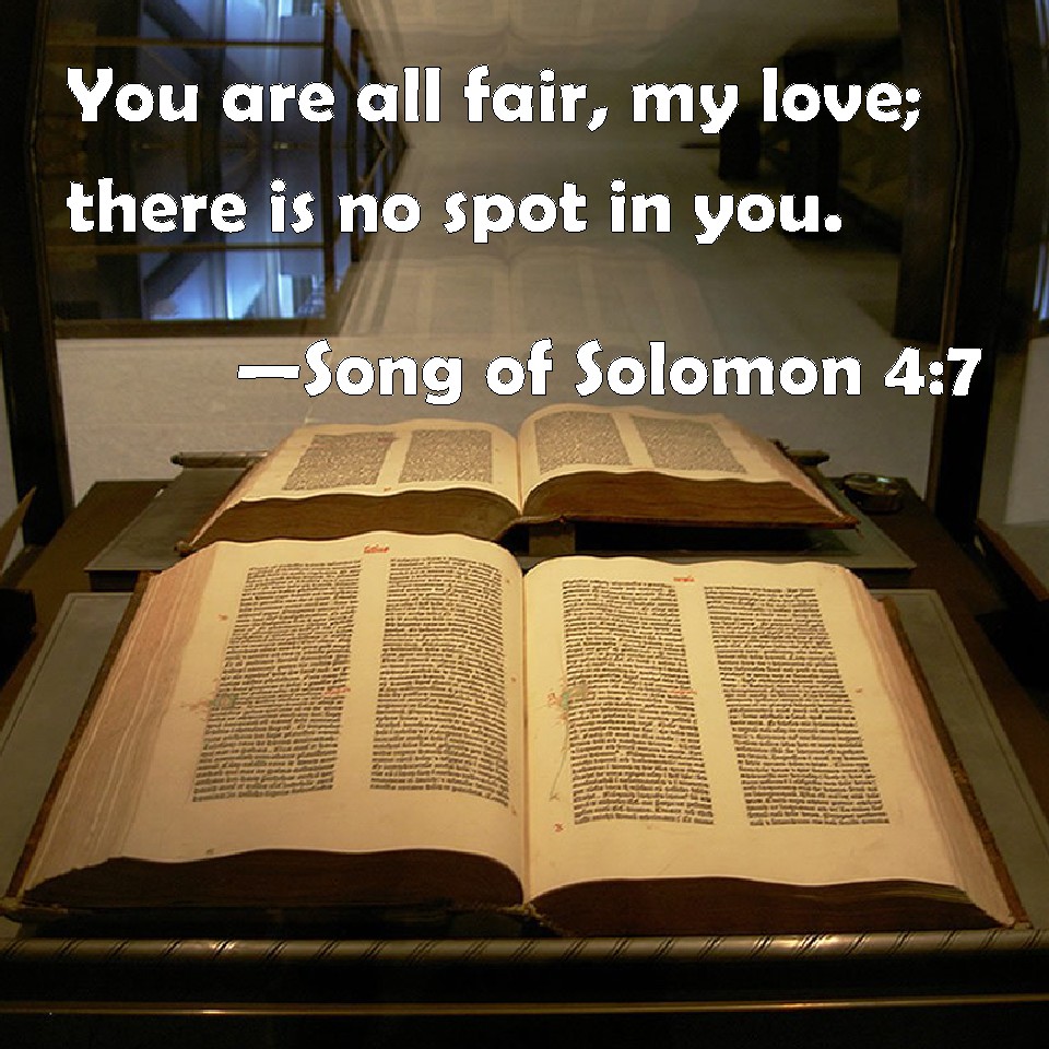 Choose a Background Song of Solomon 4:7 You are all fair, my love; there is no spot in you. KJV: Thou art all fair, my love; there is no spot in thee. DRB: Thou art all fair, O my love, and there is not a spot in thee. DBT: Thou art all fair, my love; And there is no spot in thee. ERV: Thou art all fair, my love; and there is no spot in thee. WBT: Thou art all fair, my love; there is no spot in thee. WEB: You are all beautiful, my love. There is no spot in you. YLT: Thou art all fair, my friend, And a blemish there is not in thee. Come from Lebanon, O spouse,Links Song of Solomon 4:7 NIV • Song of Solomon 4:7 NLT • Song of Solomon 4:7 ESV • Song of Solomon 4:7 NASB • Song of Solomon 4:7 KJV • Song of Solomon 4:7 Interlinear • Song of Solomon 4:7 Commentaries • Song of Solomon 4:7 Parallel Texts • Song of Solomon 4:7 Bible Apps • Song of Solomon 4:7 Parallel • Bible Hub |