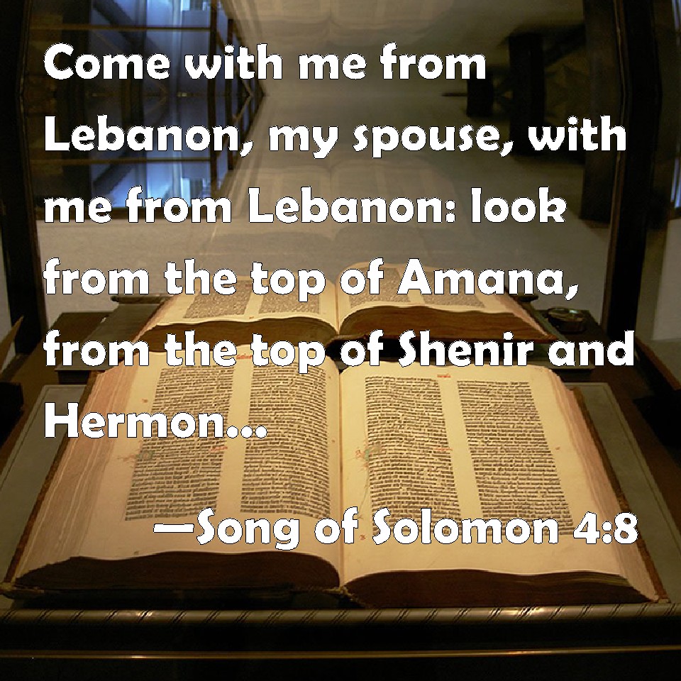 Choose a Background Song of Solomon 4:8 Come with me from Lebanon, my spouse, with me from Lebanon: look from the top of Amana, from the top of Shenir and Hermon, from the lions' dens, from the mountains of the leopards. KJV: Come with me from Lebanon, my spouse, with me from Lebanon: look from the top of Amana, from the top of Shenir and Hermon, from the lions' dens, from the mountains of the leopards. DRB: Come from Libanus, my spouse, come from Libanus, come: thou shalt be crowned from the top of Amana, from the top of Sanir and Hermon, from the dens of the lions, from the mountains of the leopards. DBT: Come with me, from Lebanon, my spouse, With me from Lebanon, Come, look from the top of Amanah, From the top of Senir and Hermon, From the lions' dens, From the mountains of the leopards. ERV: Come with me from Lebanon, my bride, with me from Lebanon: look from the top of Amana, from the top of Senir and Hermon, from the lions' dens, from the mountains of the leopards. WBT: Come with me from Lebanon, my spouse, with me from Lebanon: look from the top of Amana, from the top of Shenir and Hermon, from the lions' dens, from the mountains of the leopards. WEB: Come with me from Lebanon, my bride, with me from Lebanon. Look from the top of Amana, from the top of Senir and Hermon, from the lions' dens, from the mountains of the leopards. YLT: Come from Lebanon, come thou in. Look from the top of Amana, From the top of Shenir and Hermon, From the habitations of lions, From the mountains of leopards.Links Song of Solomon 4:8 NIV • Song of Solomon 4:8 NLT • Song of Solomon 4:8 ESV • Song of Solomon 4:8 NASB • Song of Solomon 4:8 KJV • Song of Solomon 4:8 Interlinear • Song of Solomon 4:8 Commentaries • Song of Solomon 4:8 Parallel Texts • Song of Solomon 4:8 Bible Apps • Song of Solomon 4:8 Parallel • Bible Hub |