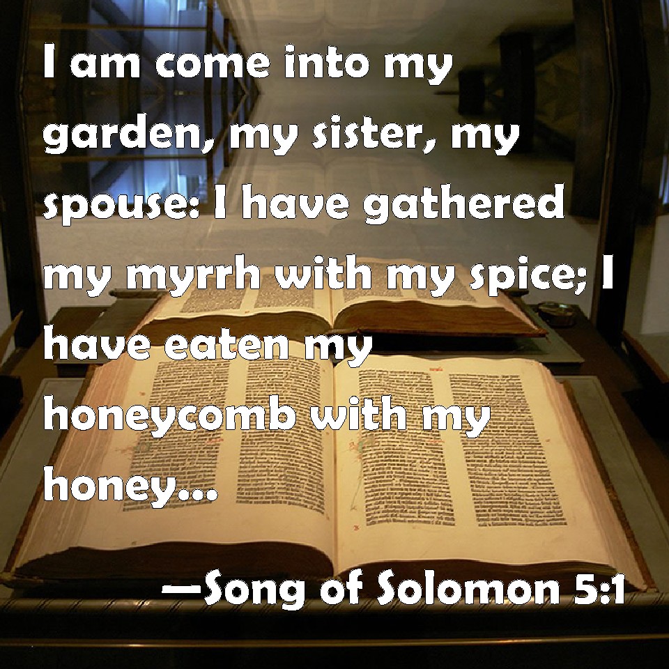 Choose a Background Song of Solomon 5:1 I am come into my garden, my sister, my spouse: I have gathered my myrrh with my spice; I have eaten my honeycomb with my honey; I have drunk my wine with my milk: eat, O friends; drink, yes, drink abundantly, O beloved. KJV: I am come into my garden, my sister, my spouse: I have gathered my myrrh with my spice; I have eaten my honeycomb with my honey; I have drunk my wine with my milk: eat, O friends; drink, yea, drink abundantly, O beloved. DRB: Let my beloved come into his garden, and eat the fruit of his apple trees. I am come into my garden, O my sister, my spouse, I have gathered my myrrh, with my aromatical spices: I have eaten the honeycomb with my honey, I have drunk my wine with my milk: eat, O friends, and drink, and be inebriated, my dearly beloved. DBT: I am come into my garden, my sister, my spouse; I have gathered my myrrh with my spice; I have eaten my honeycomb with my honey; I have drunk my wine with my milk. Eat, O friends; drink, yea, drink abundantly, beloved ones! ERV: I AM come into my garden, my sister, my bride: I have gathered my myrrh with my spice; I have eaten my honeycomb with my honey; I have drunk my wine with my milk. Eat, O friends; drink, yea, drink abundantly, O beloved. WBT: I have come into my garden, my sister, my spouse: I have gathered my myrrh, with my spice; I have eaten my honey-comb with my honey; I have drank my wine with my milk: eat, O friends; drink, yes, drink abundantly, O beloved. WEB: I have come into my garden, my sister, my bride. I have gathered my myrrh with my spice; I have eaten my honeycomb with my honey; I have drunk my wine with my milk. Friends Eat, friends! Drink, yes, drink abundantly, beloved. Beloved YLT: I have come in to my garden, my sister-spouse, I have plucked my myrrh with my spice, I have eaten my comb with my honey, I have drunk my wine with my milk. Eat, O friends, drink, Yea, drink abundantly, O beloved ones!Links Song of Solomon 5:1 NIV • Song of Solomon 5:1 NLT • Song of Solomon 5:1 ESV • Song of Solomon 5:1 NASB • Song of Solomon 5:1 KJV • Song of Solomon 5:1 Interlinear • Song of Solomon 5:1 Commentaries • Song of Solomon 5:1 Parallel Texts • Song of Solomon 5:1 Bible Apps • Song of Solomon 5:1 Parallel • Bible Hub |