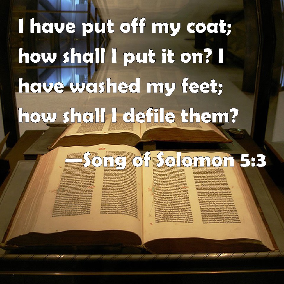 Song of Solomon 5:3 I have put off my coat; how shall I put it on? I have washed my feet; how shall I defile them?
