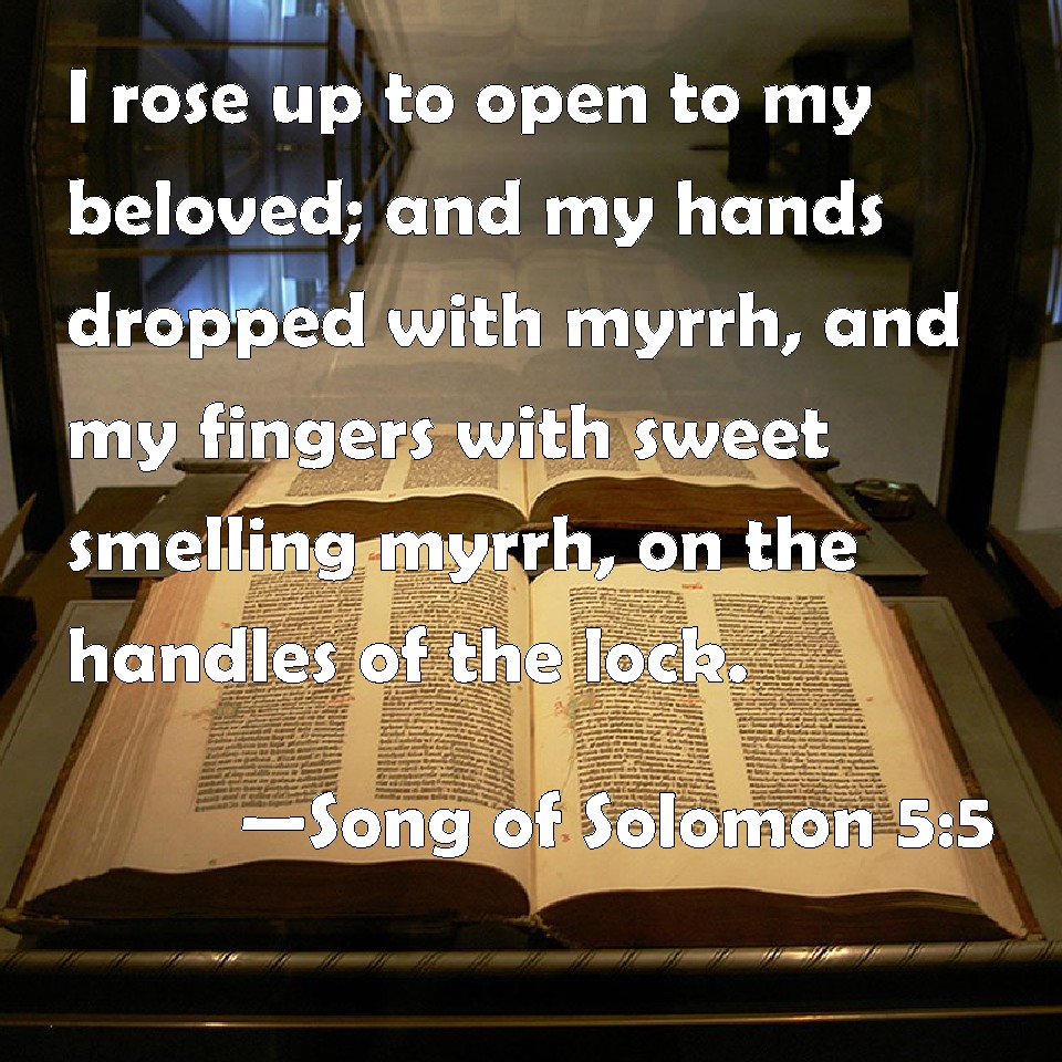 Choose a Background Song of Solomon 5:5 I rose up to open to my beloved; and my hands dropped with myrrh, and my fingers with sweet smelling myrrh, on the handles of the lock. KJV: I rose up to open to my beloved; and my hands dropped with myrrh, and my fingers with sweet smelling myrrh, upon the handles of the lock. DRB: I arose up to open to my beloved: my hands dropped with myrrh, and my fingers were full of the choicest myrrh. DBT: I rose up to open to my beloved; And my hands dropped with myrrh, And my fingers with liquid myrrh, Upon the handles of the lock. ERV: I rose up to open to my beloved; and my hands dropped with myrrh, and my fingers with liquid myrrh, upon the handles of the bolt. WBT: I rose up to open to my beloved: and my hands dropped with myrrh, and my fingers with sweet-smelling myrrh, upon the handles of the lock. WEB: I rose up to open for my beloved. My hands dripped with myrrh, my fingers with liquid myrrh, on the handles of the lock. YLT: I rose to open to my beloved, And my hands dropped myrrh, Yea, my fingers flowing myrrh, On the handles of the lock.Links Song of Solomon 5:5 NIV • Song of Solomon 5:5 NLT • Song of Solomon 5:5 ESV • Song of Solomon 5:5 NASB • Song of Solomon 5:5 KJV • Song of Solomon 5:5 Interlinear • Song of Solomon 5:5 Commentaries • Song of Solomon 5:5 Parallel Texts • Song of Solomon 5:5 Bible Apps • Song of Solomon 5:5 Parallel • Bible Hub |
