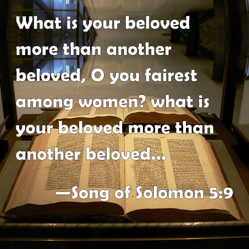 Choose a Background Song of Solomon 5:9 What is your beloved more than another beloved, O you fairest among women? what is your beloved more than another beloved, that you do so charge us? KJV: What is thy beloved more than another beloved, O thou fairest among women? what is thy beloved more than another beloved, that thou dost so charge us? DRB: What manner of one is thy beloved of the beloved, O thou most beautiful among women? what manner of one is thy beloved of the beloved, that thou hast so adjured us? DBT: What is thy beloved more than another beloved, Thou fairest among women? What is thy beloved more than another beloved, That thou dost so charge us? ERV: What is thy beloved more than another beloved, O thou fairest among women? what is thy beloved more than another beloved, that thou dost so adjure us? WBT: What is thy beloved more than another beloved, O thou fairest among women? what is thy beloved more than another beloved, that thou dost so charge us? WEB: How is your beloved better than another beloved, you fairest among women? How is your beloved better than another beloved, that you do so adjure us? Beloved YLT: What is thy beloved above any beloved, O fair among women? What is thy beloved above any beloved, That thus thou hast adjured us?Links Song of Solomon 5:9 NIV • Song of Solomon 5:9 NLT • Song of Solomon 5:9 ESV • Song of Solomon 5:9 NASB • Song of Solomon 5:9 KJV • Song of Solomon 5:9 Interlinear • Song of Solomon 5:9 Commentaries • Song of Solomon 5:9 Parallel Texts • Song of Solomon 5:9 Bible Apps • Song of Solomon 5:9 Parallel • Bible Hub |