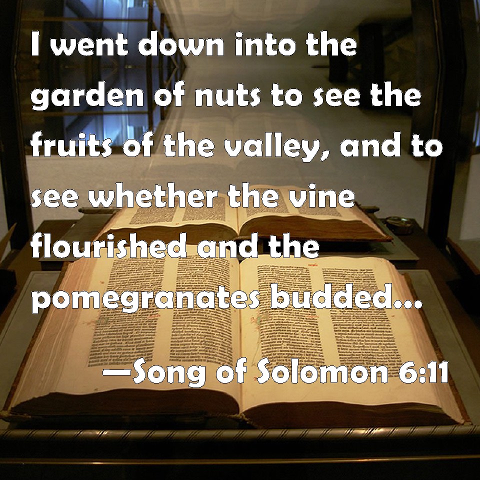 Choose a Background Song of Solomon 6:11 I went down into the garden of nuts to see the fruits of the valley, and to see whether the vine flourished and the pomegranates budded. KJV: I went down into the garden of nuts to see the fruits of the valley, and to see whether the vine flourished, and the pomegranates budded. DRB: I went down into the garden of nuts, to see the fruits of the valleys, and to look if the vineyard had flourished, and the pomegranates budded. DBT: I went down into the garden of nuts, To see the verdure of the valley, To see whether the vine budded, Whether the pomegranates blossomed. ERV: I went down into the garden of nuts, to see the green plants of the valley, to see whether the vine budded, and the pomegranates were in flower. WBT: I went down into the garden of nuts to see the fruits of the valley, and to see whether the vine flourished, and the pomegranates budded. WEB: I went down into the nut tree grove, to see the green plants of the valley, to see whether the vine budded, and the pomegranates were in flower. YLT: Unto a garden of nuts I went down, To look on the buds of the valley, To see whither the vine had flourished, The pomegranates had blossomed — Links Song of Solomon 6:11 NIV • Song of Solomon 6:11 NLT • Song of Solomon 6:11 ESV • Song of Solomon 6:11 NASB • Song of Solomon 6:11 KJV • Song of Solomon 6:11 Interlinear • Song of Solomon 6:11 Commentaries • Song of Solomon 6:11 Parallel Texts • Song of Solomon 6:11 Bible Apps • Song of Solomon 6:11 Parallel • Bible Hub |