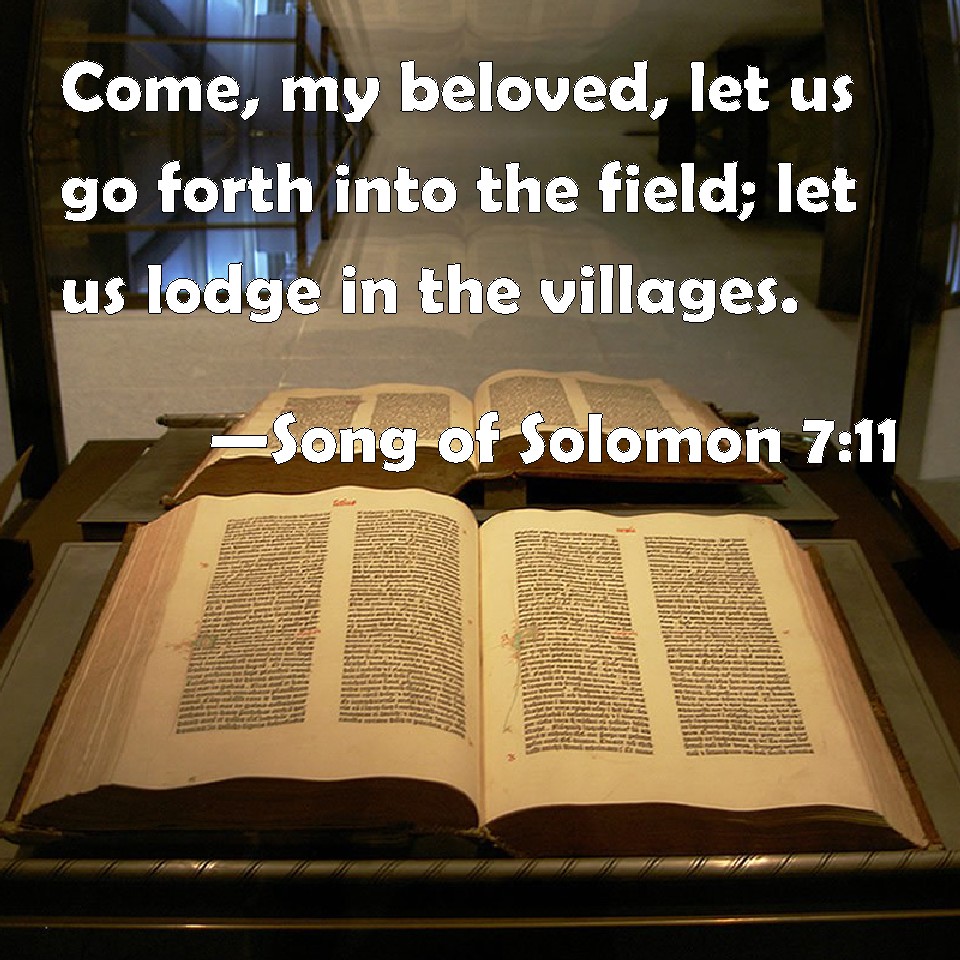 Choose a Background Song of Solomon 7:11 Come, my beloved, let us go forth into the field; let us lodge in the villages. KJV: Come, my beloved, let us go forth into the field; let us lodge in the villages. DRB: Come, my beloved, let us go forth into the field, let us abide in the villages. DBT: Come, my beloved, let us go forth into the fields; Let us lodge in the villages. ERV: Come, my beloved, let us go forth into the field; let us lodge in the villages. WBT: Come, my beloved, let us go forth into the field; let us lodge in the villages. WEB: Come, my beloved, let us go forth into the field. Let us lodge in the villages. YLT: Come, my beloved, we go forth to the field,Links Song of Solomon 7:11 NIV • Song of Solomon 7:11 NLT • Song of Solomon 7:11 ESV • Song of Solomon 7:11 NASB • Song of Solomon 7:11 KJV • Song of Solomon 7:11 Interlinear • Song of Solomon 7:11 Commentaries • Song of Solomon 7:11 Parallel Texts • Song of Solomon 7:11 Bible Apps • Song of Solomon 7:11 Parallel • Bible Hub |