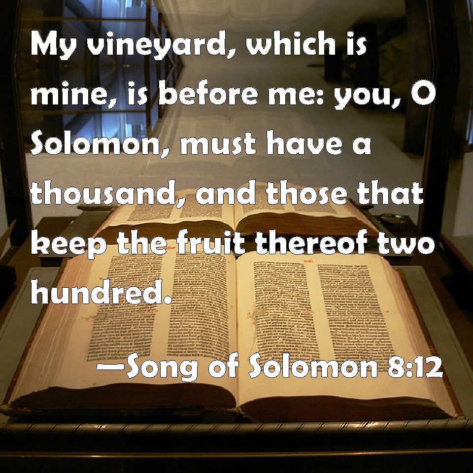 Choose a Background Song of Solomon 8:12 My vineyard, which is mine, is before me: you, O Solomon, must have a thousand, and those that keep the fruit thereof two hundred. KJV: My vineyard, which is mine, is before me: thou, O Solomon, must have a thousand, and those that keep the fruit thereof two hundred. DRB: My vineyard is before me. A thousand are for thee, the peaceable, and two hundred for them that keep the fruit thereof. DBT: My vineyard, which is mine, is before me: The thousand silver-pieces be to thee, Solomon; And to the keepers of its fruit, two hundred. ERV: My vineyard, which is mine, is before me: thou, O Solomon, shalt have the thousand, and those that keep the fruit thereof two hundred. WBT: My vineyard which is mine, is before me: thou, O Solomon, must have a thousand, and those that keep the fruit of it two hundred. WEB: My own vineyard is before me. The thousand are for you, Solomon; two hundred for those who tend its fruit. Lover YLT: My vineyard — my own — is before me, The thousand is for thee, O Solomon. And the two hundred for those keeping its fruit. O dweller in gardens!Links Song of Solomon 8:12 NIV • Song of Solomon 8:12 NLT • Song of Solomon 8:12 ESV • Song of Solomon 8:12 NASB • Song of Solomon 8:12 KJV • Song of Solomon 8:12 Interlinear • Song of Solomon 8:12 Commentaries • Song of Solomon 8:12 Parallel Texts • Song of Solomon 8:12 Bible Apps • Song of Solomon 8:12 Parallel • Bible Hub |