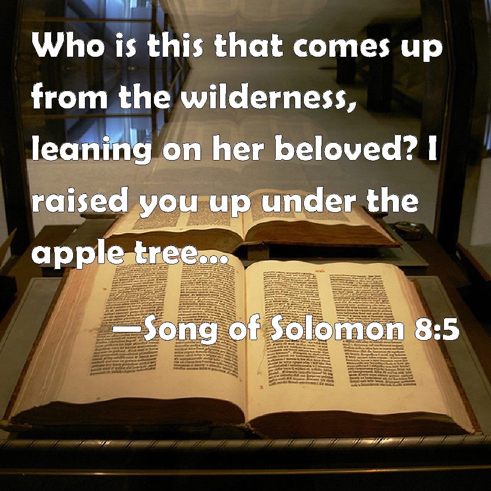 Choose a Background Song of Solomon 8:5 Who is this that comes up from the wilderness, leaning on her beloved? I raised you up under the apple tree: there your mother brought you forth: there she brought you forth that bore you. KJV: Who is this that cometh up from the wilderness, leaning upon her beloved? I raised thee up under the apple tree: there thy mother brought thee forth: there she brought thee forth that bare thee. DRB: Who is this that cometh up from the desert, flowing with delights, leaning upon her beloved? Under the apple tree I raised thee up: there thy mother was corrupted, there she was defloured that bore thee. DBT: Who is this that cometh up from the wilderness, Leaning upon her beloved? I awoke thee under the apple-tree: There thy mother brought thee forth; There she brought thee forth that bore thee. ERV: Who is this that cometh up from the wilderness, leaning upon her beloved? Under the apple tree I awakened thee: there thy mother was in travail with thee, there was she in travail that brought thee forth. WBT: Who is this that cometh up from the wilderness, leaning upon her beloved? I raised thee up under the apple-tree: there thy mother brought thee forth: there she brought thee forth that bore thee. WEB: Who is this who comes up from the wilderness, leaning on her beloved? Under the apple tree I aroused you. There your mother conceived you. There she was in labor and bore you. YLT: Who is this coming from the wilderness, Hasting herself for her beloved? Under the citron-tree I have waked thee, There did thy mother pledge thee, There she gave a pledge that bare thee.Links Song of Solomon 8:5 NIV • Song of Solomon 8:5 NLT • Song of Solomon 8:5 ESV • Song of Solomon 8:5 NASB • Song of Solomon 8:5 KJV • Song of Solomon 8:5 Interlinear • Song of Solomon 8:5 Commentaries • Song of Solomon 8:5 Parallel Texts • Song of Solomon 8:5 Bible Apps • Song of Solomon 8:5 Parallel • Bible Hub |