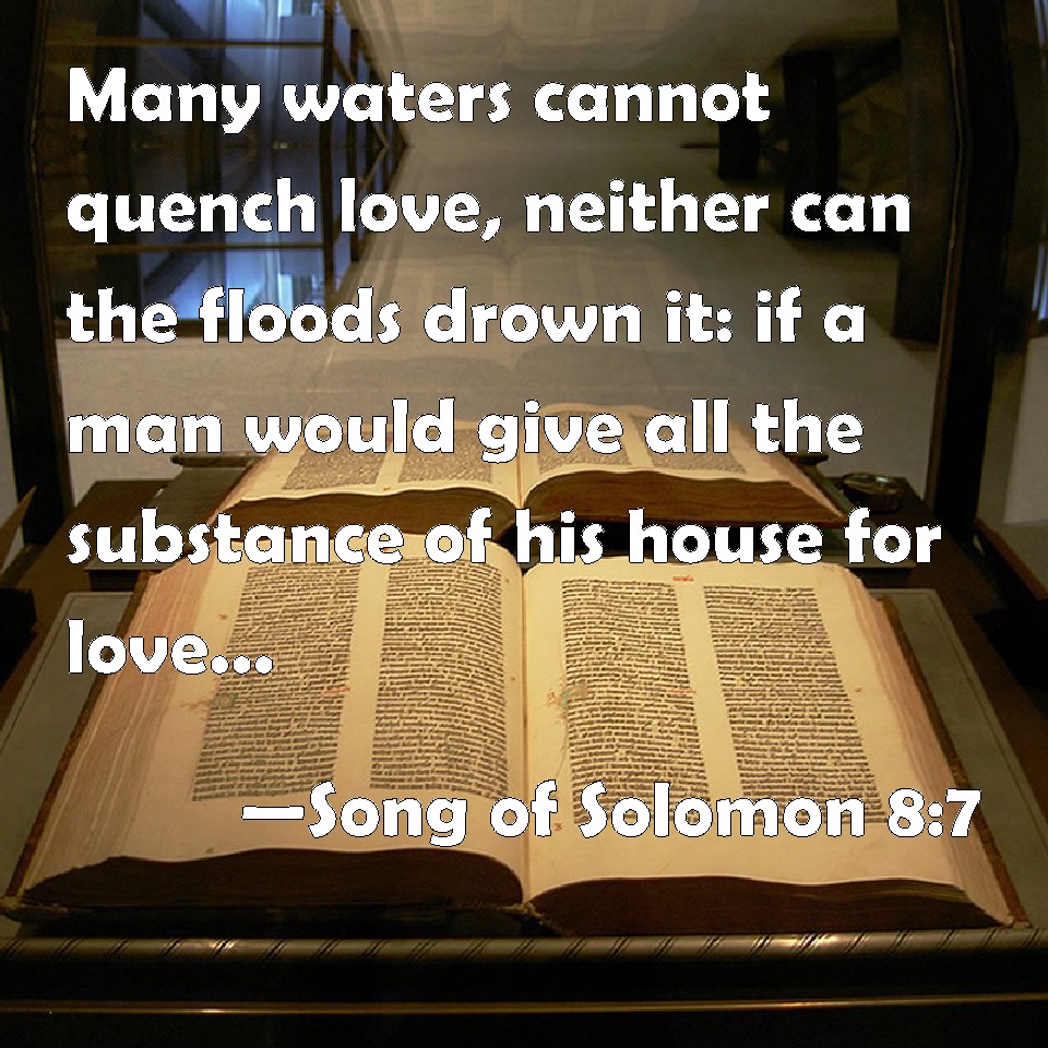 Choose a Background Song of Solomon 8:7 Many waters cannot quench love, neither can the floods drown it: if a man would give all the substance of his house for love, it would utterly be contemned. KJV: Many waters cannot quench love, neither can the floods drown it: if a man would give all the substance of his house for love, it would utterly be contemned. DRB: Many waters cannot quench charity, neither can the floods drown it: if a man should give all the substance of his house for love, he shall despise it as nothing. DBT: Many waters cannot quench love, Neither do the floods drown it: Even if a man gave all the substance of his house for love, It would utterly be contemned. ERV: Many waters cannot quench love, neither can the floods drown it: if a man would give all the substance of his house for love, he would utterly be contemned. WBT: Many waters cannot quench love, neither can the floods drown it: if a man would give all the substance of his house for love, it would utterly be contemned. WEB: Many waters can't quench love, neither can floods drown it. If a man would give all the wealth of his house for love, he would be utterly scorned. Friends YLT: Many waters are not able to quench the love, And floods do not wash it away. If one give all the wealth of his house for love, Treading down — they tread upon it.Links Song of Solomon 8:7 NIV • Song of Solomon 8:7 NLT • Song of Solomon 8:7 ESV • Song of Solomon 8:7 NASB • Song of Solomon 8:7 KJV • Song of Solomon 8:7 Interlinear • Song of Solomon 8:7 Commentaries • Song of Solomon 8:7 Parallel Texts • Song of Solomon 8:7 Bible Apps • Song of Solomon 8:7 Parallel • Bible Hub |